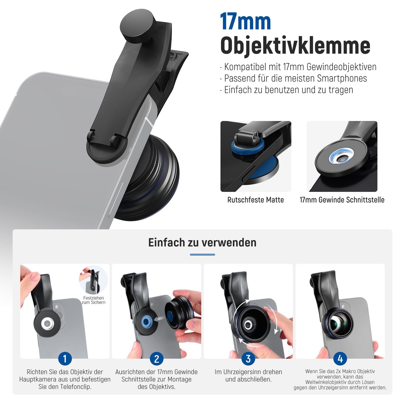 - Professionelle 2 in 1 Handy Objektivklemme- Das Ersatzobjektiv für die Handykamera besteht aus einem Weitwinkelobjektiv (breiteres Sichtfeld) und einem Makroobjektiv (detaillierte Nahaufnahme), ausgestattet mit einem 17mm auf 37mm Adapterring und einem 17mm Smartphone Objektiv Clip und einem vorderen Filteradapterring (passt sich an den 67mm Filter an), geeignet für 17mm und 37mm Gewindeschnittstellen, kompatibel mit iPhone, kompatibel mit Samsung und anderen Android Handys