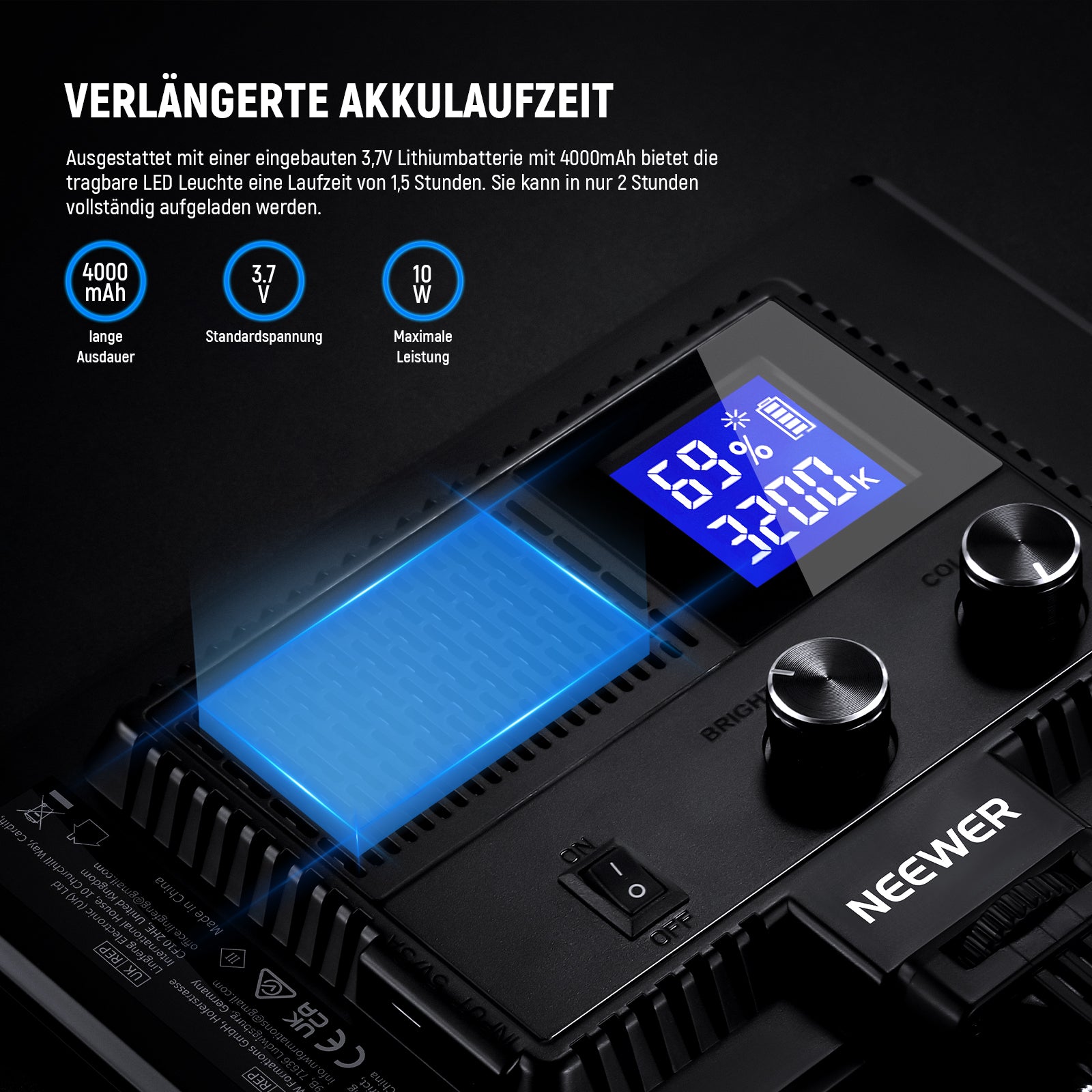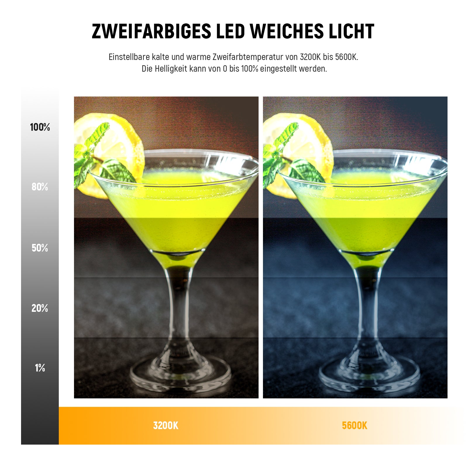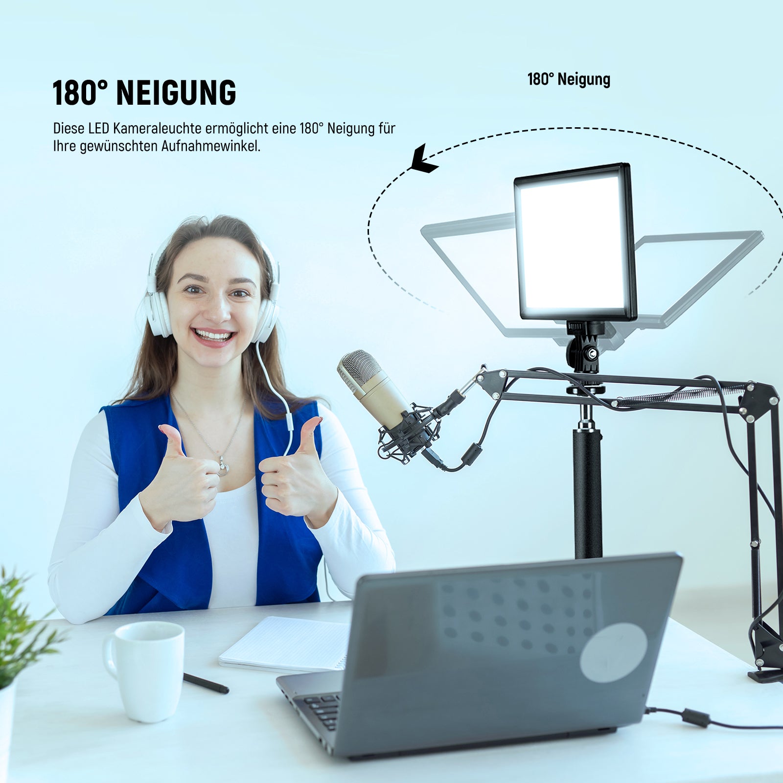 - Vielseitiges LED Videoleuchte Panel Bausatz- Das 9" LED Video Licht verfügt über 58 warme und 58 kalte LEDs und liefert maximale Leistung von 10W mit einer maximalen Beleuchtung von 0,5m und einem hohen Farbwiedergabeindex (CRI) von 95+, ideal für Porträts, Live Streaming usw. Außerdem mit einem Ministativ zur Höhenverstellung, einem Cold Shoe Adapter zur Winkelpositionierung, einem USB Kabel und einer eingebauten 4000mAh Lithiumbatterie zum Aufladen. Hinweis: Tragetasche ist NICHT enthalten