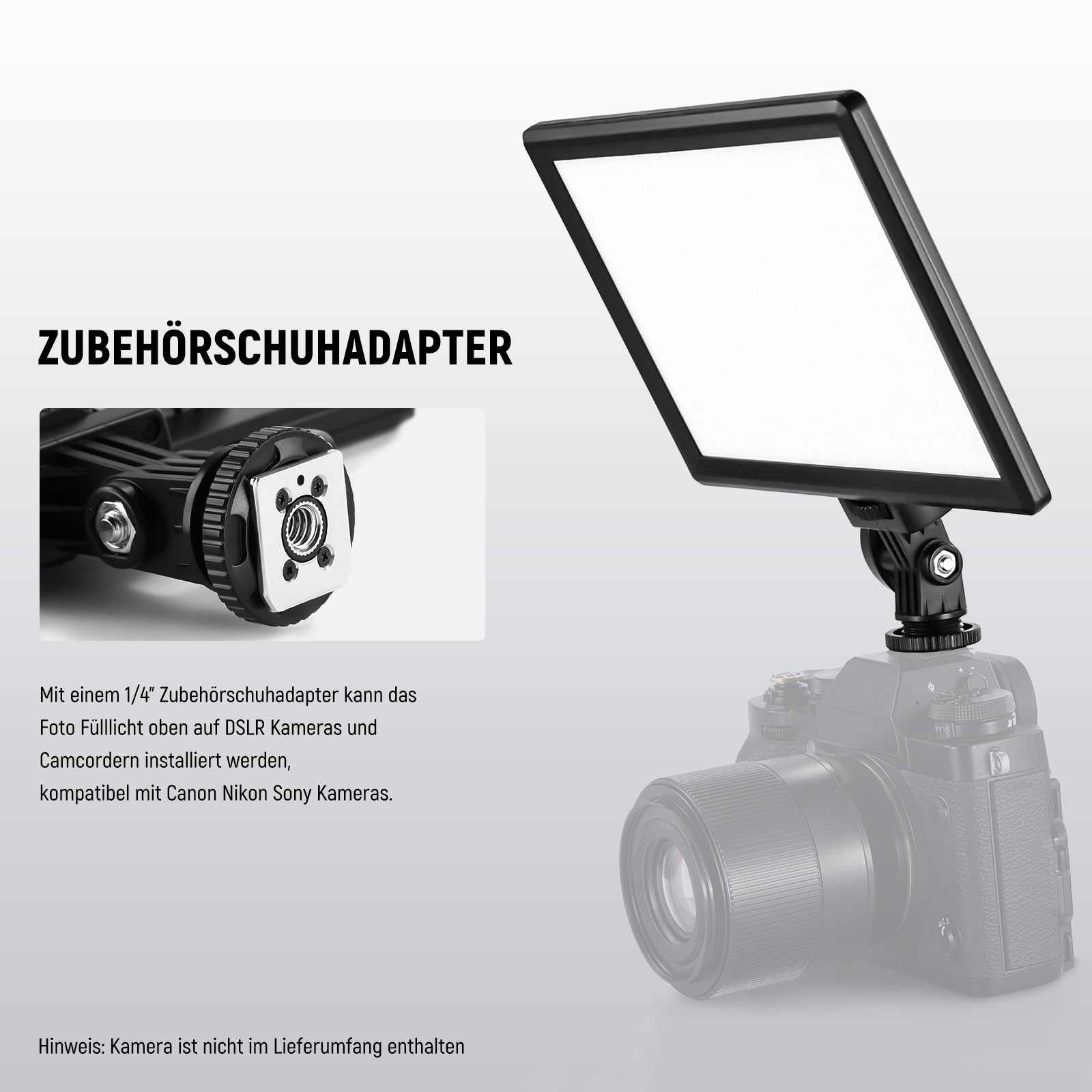 - Flexible Montage mit Cold Shoe Adapter- Mit einem 1/4" Cold Shoe Adapter kann das Fotografie Fülllicht auf der Oberseite von DSLR Kameras und Camcordern installiert werden, ist kompatibel mit Canon Nikon Sony Kameras und ermöglicht eine Neigung von 180° nach vorne und hinten für die gewünschten Aufnahmewinkel
