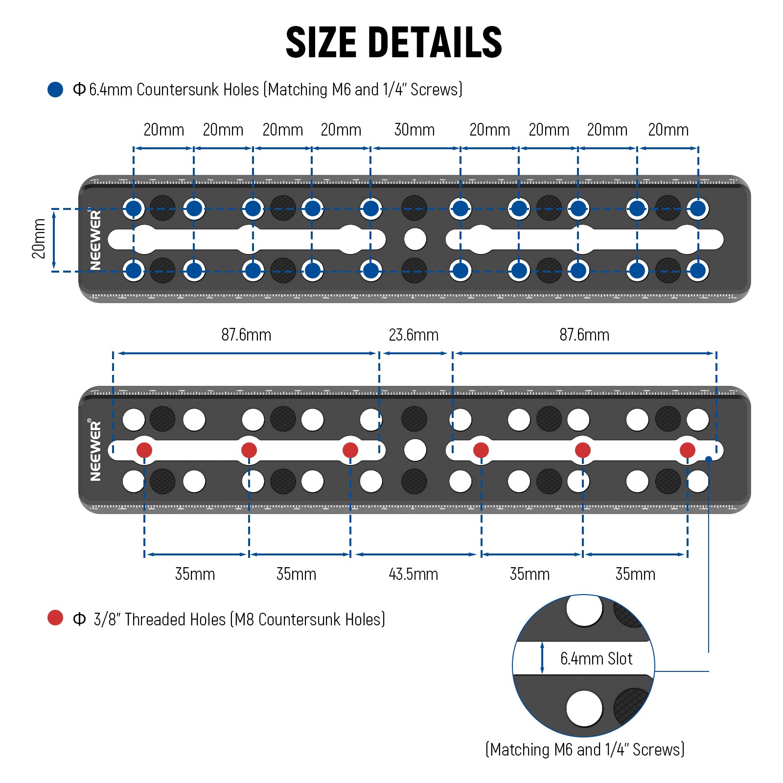 - 【Zwanzig 1/4" Schraubenlöcher】 Zwanzig 1/4" Schraubenlöcher sind gleichmäßig auf beiden Seiten der Senkschlitze verteilt, mit einem Abstand von 0,8" (20 mm) voneinander. Diese Löcher sind nützlich für die Montage einer Vielzahl von Geräten mit dem passendem Gewinde