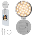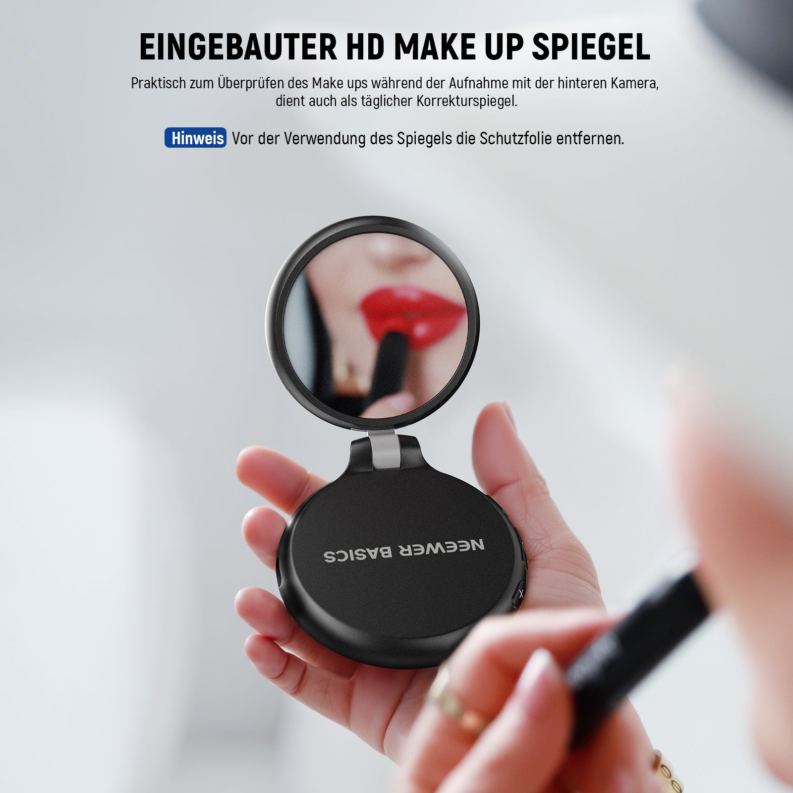 Multifunktionales Mini Selfie Licht mit Spiegel- Dieses kompakte, leichte Foto LED Füllleuchte für Handy Fotografie und Videoanrufe lässt sich auf nur 73x67x23mm zusammenfalten, so dass Sie es einfach in Ihre Tasche stecken und überallhin mitnehmen können. Befestigen Sie es am Telefon, um von oben zu filmen, oder stellen Sie es auf den Tisch als Telefonhalterung, die mit dem iPhone kompatibel ist, um Aufnahmen zu erstellen, und als Schminkspiegel, um Ihr Makeup im Freien aufzufrischen