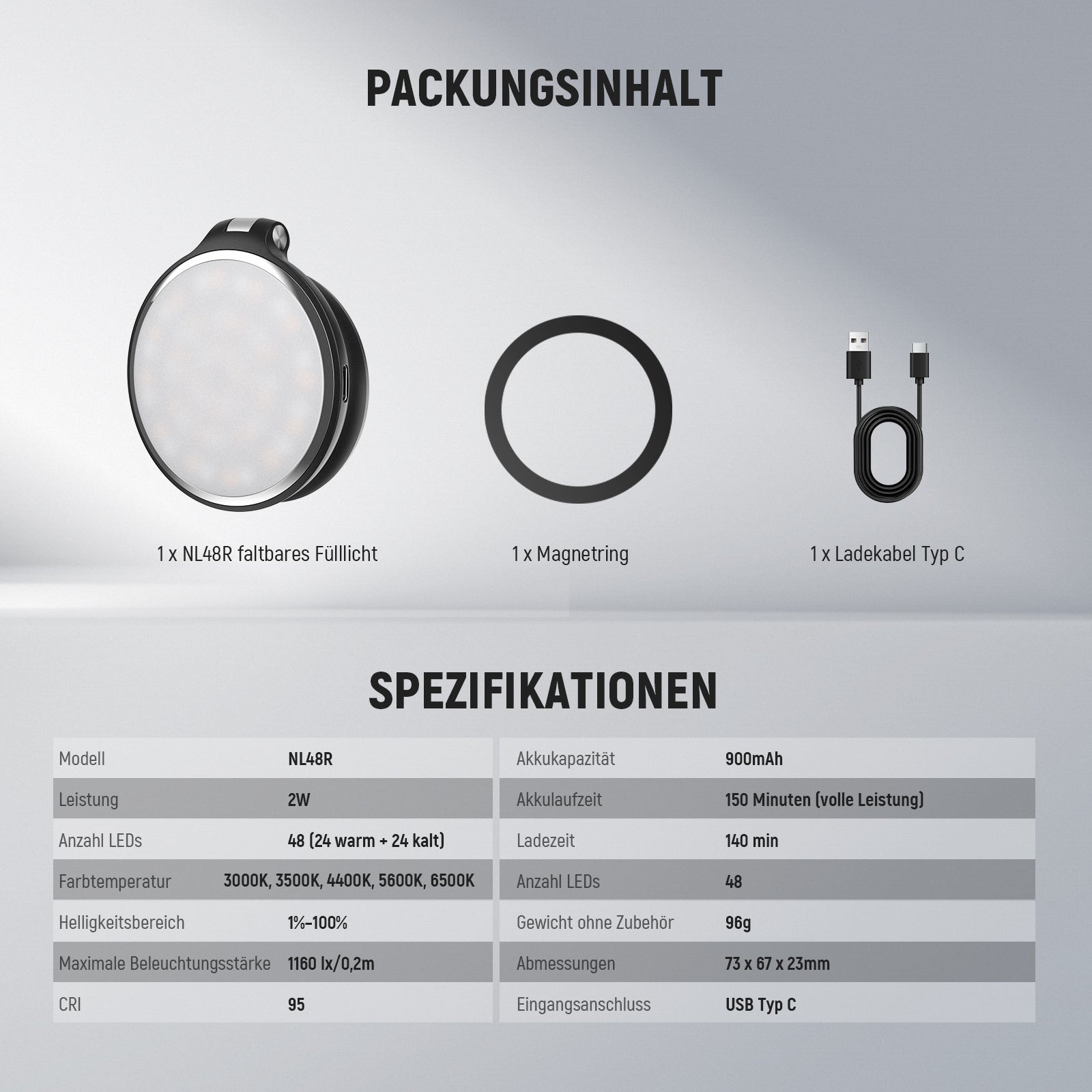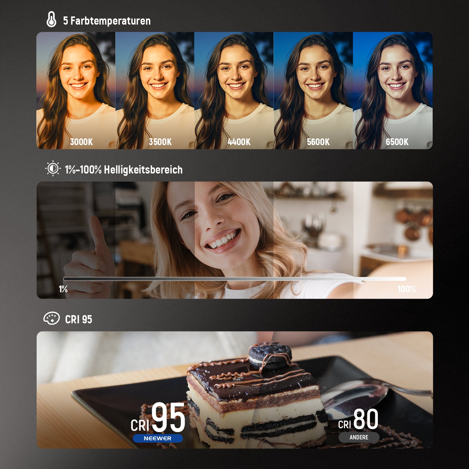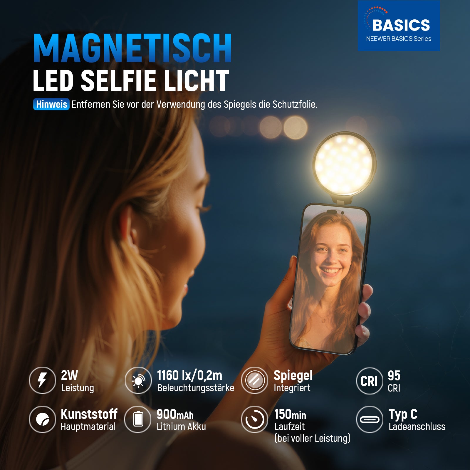 - Einführung NEEWER BASICS- Einfach und praktisch, NEEWER BASICS ist eine wirtschaftliche Produktlinie, die sich auf wesentliche Funktionen und Designs konzentriert, ohne unnötige Extras und Materialien. Das NL48R Fotolicht für die Fotografie ist eine ultrakompakte und tragbare Selfie Handylicht mit 48 Premium LEDs, die eine Beleuchtungsstärke von 1160lx/0,2m mit einstellbarer Farbtemperatur und Helligkeit und CRI95 bieten, um Ihren Teint zu verbessern und Gesichtsunreinheiten zu reduzieren