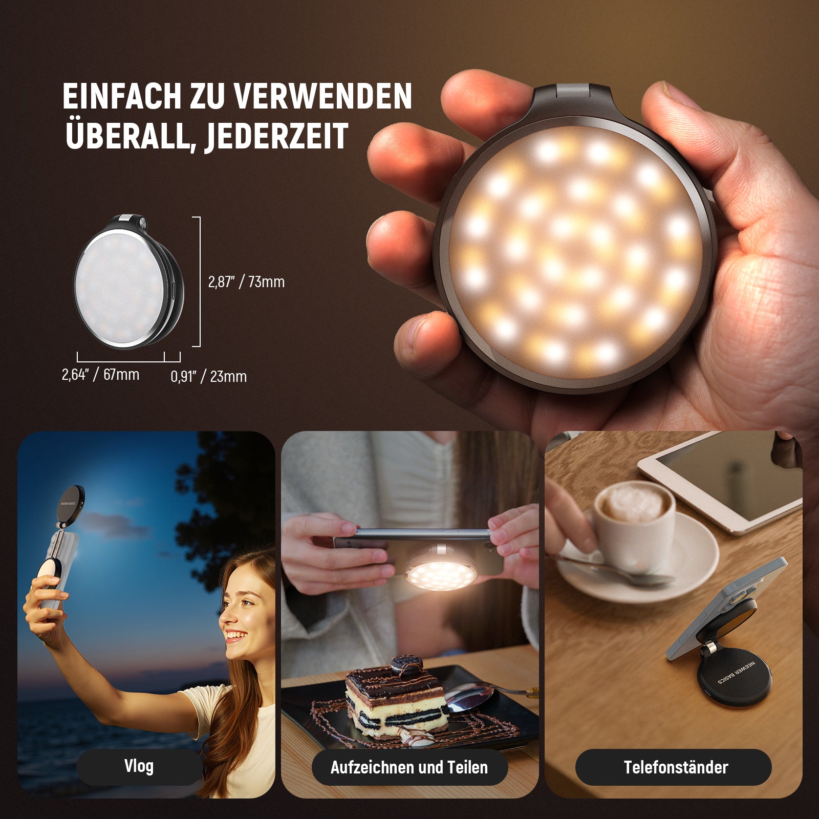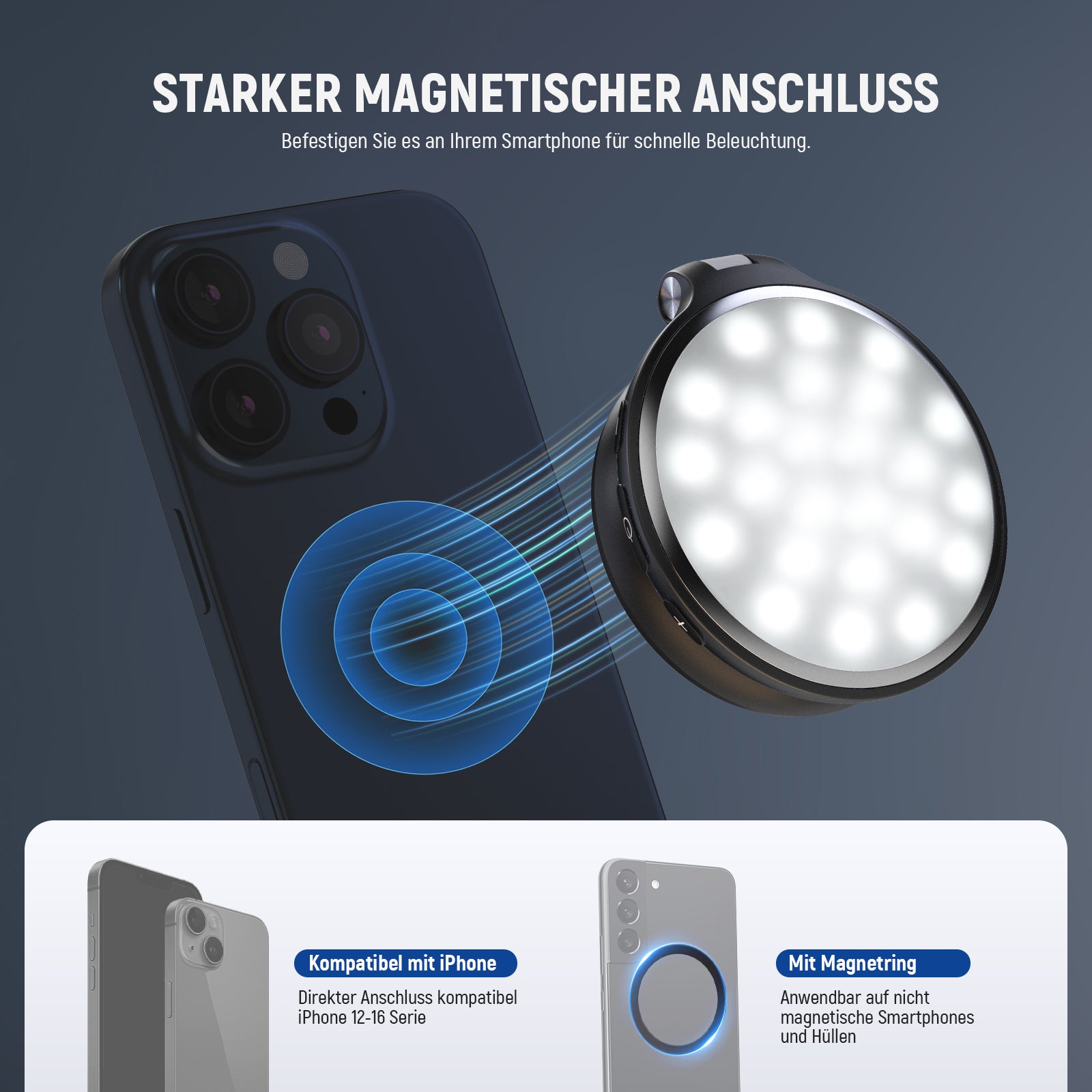 - Schnelle magnetische Befestigung & einstellbarer Winkel- Die Mini Key Light mit starker Magnetkraft ist kompatibel mit iPhone 16 Pro Max Plus 15/14/13/12 Mini MacBook Air MagSafe. Für nicht magnetische Geräte, wenden Sie den mitgelieferten magnetischen Klebering für eine einfache Einrichtung auf Android Handys, Laptops, kompatibel mit iPad Pro Samsung Galaxy S25 S24 S23 Ultra, etc. Das Selfie Video Light für die Fotografie Zubehör unterstützt vertikale Neigung und Höhenerweiterung