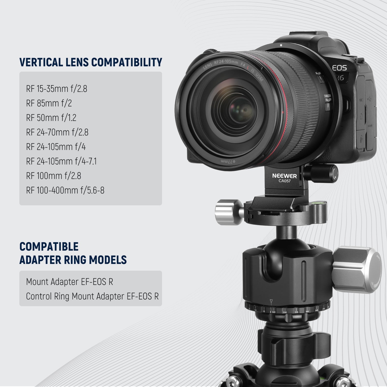 - 【Flexible Winkel und verbesserte Balance】Diese NEEWER CA057 Montageplatte mit drehbarem Kragen ermöglicht, horizontale und vertikale Aufnahmen ohne Stabilitäts Kompromisse und verbessert die Balance. Kompatibel mit Canon R5 / R5C / R6 / R6 Mark II Vollformatkameras, kompatibel mit Canon EF EOS R Montage Adapter und Steuerring Montage Adapter, RF 24-70mm f/2.8 24-105mm f/4 24-105mm f/4-7.1 85mm f/2 50mm f/1.2 100-400mm f/5.6-8 15-35mm f/2.8 100mm f/2.8 Kameraobjektive