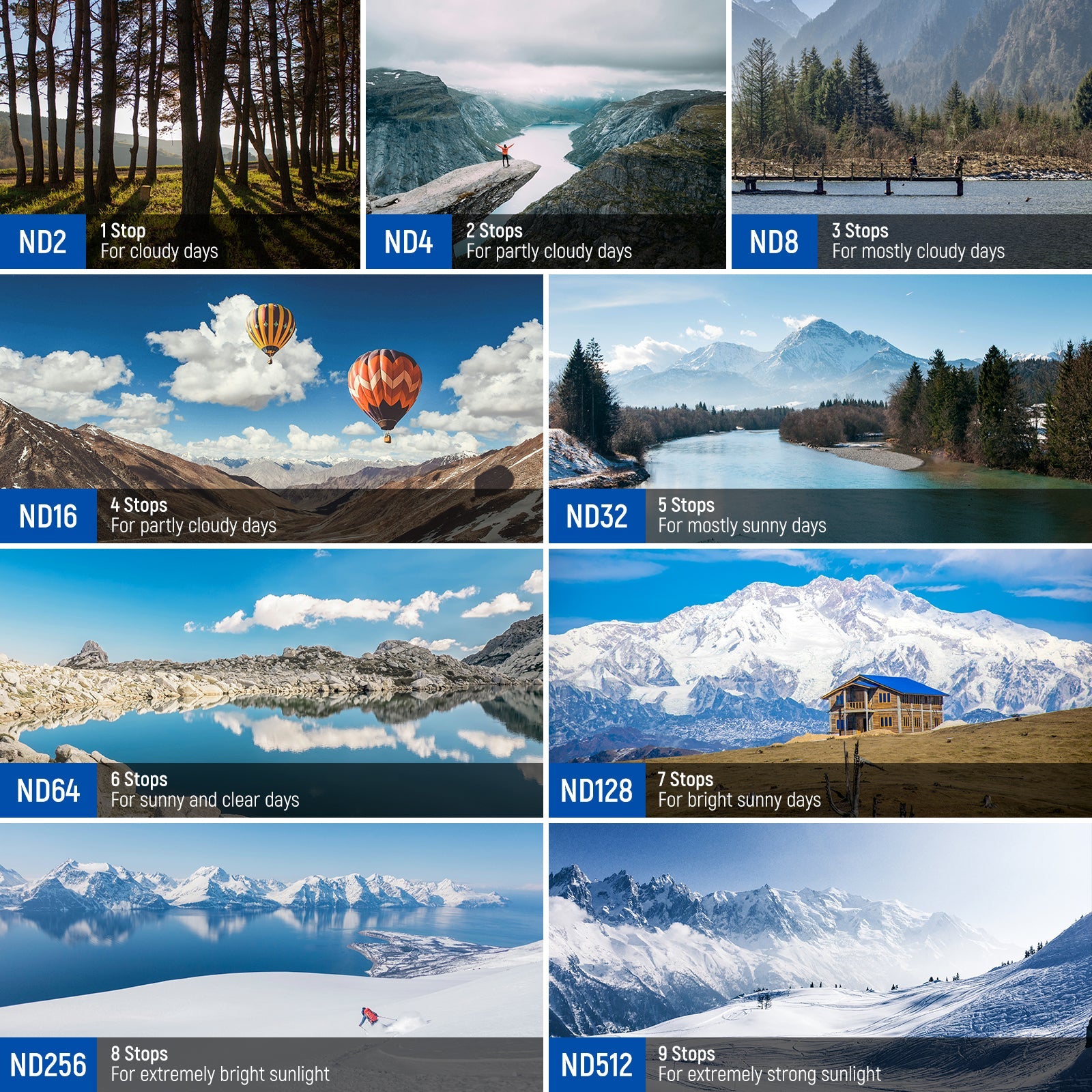 - Mühelose Balance der Belichtung- Diese beiden variablen ND Filter bieten eine Lichtreduzierung von 1-5 Stops bzw. 6-9 Stops und eignen sich für Langzeitbelichtungen bei sonnigen und hellen Außenbedingungen. Sie ermöglichen Aufnahmen mit längeren Verschlusszeiten und größeren Blendenöffnungen und sorgen für ausdrucksstarke Bewegungsunschärfeeffekte bei sich bewegenden Motiven