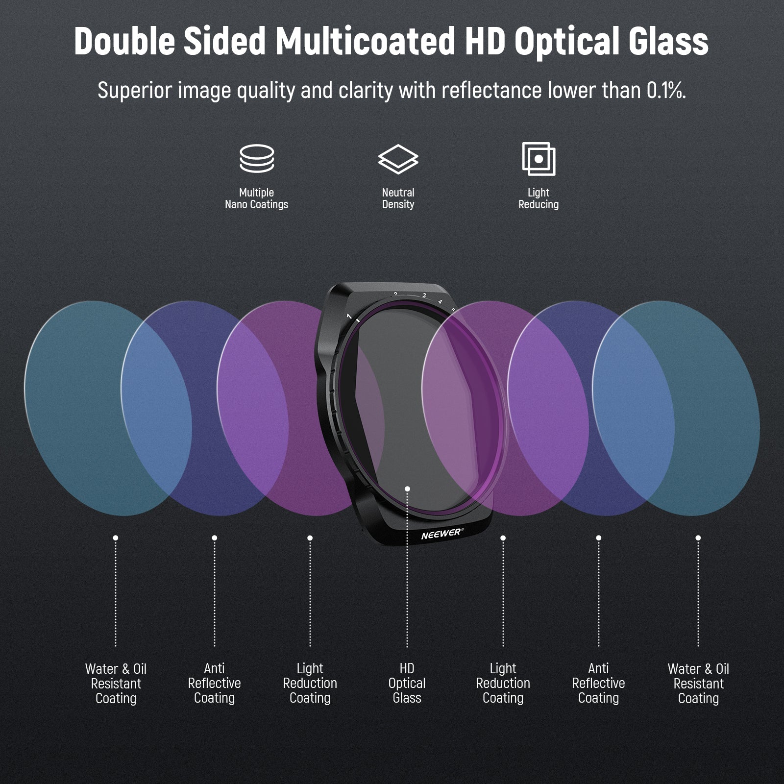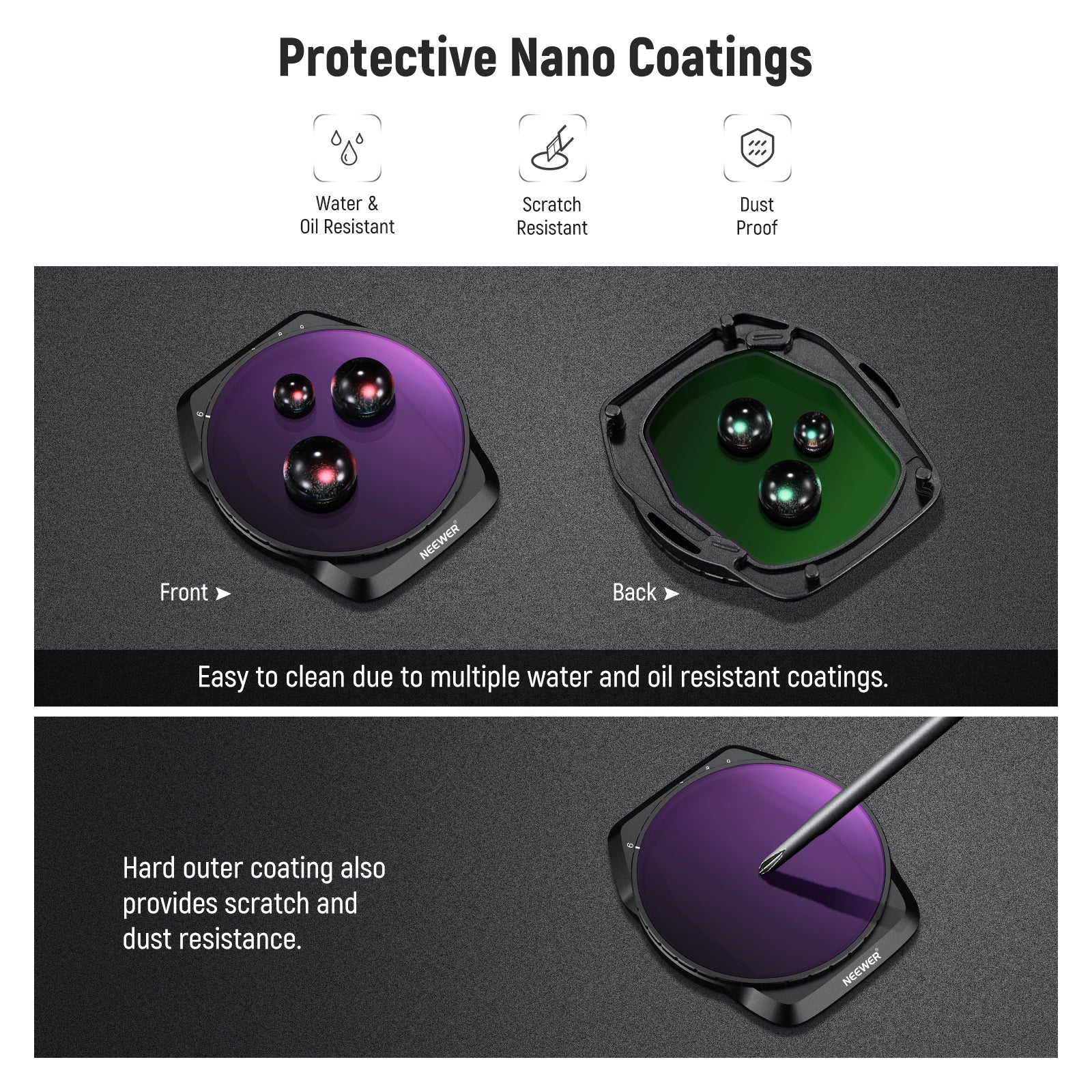 - Mehrfach beschichtetes optisches HD Glas- Optisches HD Glas sorgt für hohe Klarheit und präzise Farbwiedergabe. Mehrere Beschichtungen auf beiden Seiten des Glases sind resistent gegen Wasser, Fingerabdrücke, Schmutz und Kratzer, sodass die Filter leicht zu reinigen sind
