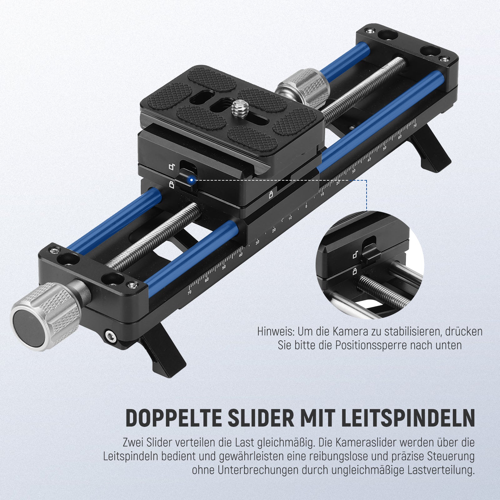 - Doppelte Slider mit Leitspindeln- Zwei Slider verteilen die Last gleichmäßig. Die über die Leitspindeln betriebenen Kameraslider sorgen für eine reibungslose und präzise Steuerung ohne Unterbrechungen durch ungleichmäßige Lastverteilung
