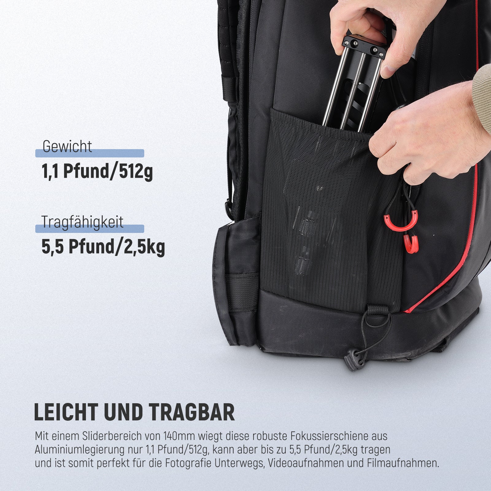 Robuste Konstruktion aus Aluminiumlegierung- Mit einem Schiebebereich von 140mm wiegt diese robuste Fokussierschiene aus Aluminiumlegierung nur 1,1 Pfund/512g, kann jedoch bis zu 5,5 Pfund/2,5kg tragen und ist perfekt für die Fotografie unterwegs, Videoaufnahmen und Filmaufnahmen geeignet