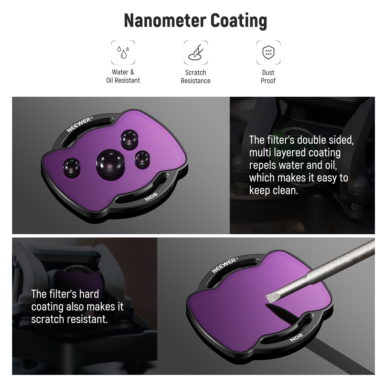 - 【30 Schichten NANO beschichtetes optisches HD Glas】 Die Filter sind aus importiertem optischem HD Glas mit großer Lichtdurchlässigkeit und hoher Auflösungsqualität hergestellt. Die doppelseitigen, mehrschichtigen NANO Beschichtungen sind wasserabweisend, kratzfest und ölbeständig und reduzieren effektiv die Blendung und Reflexion. Der leichte Rahmen aus Aluminiumlegierung hat minimale Auswirkungen auf die Kalibrierung des Gimbals der Drohne