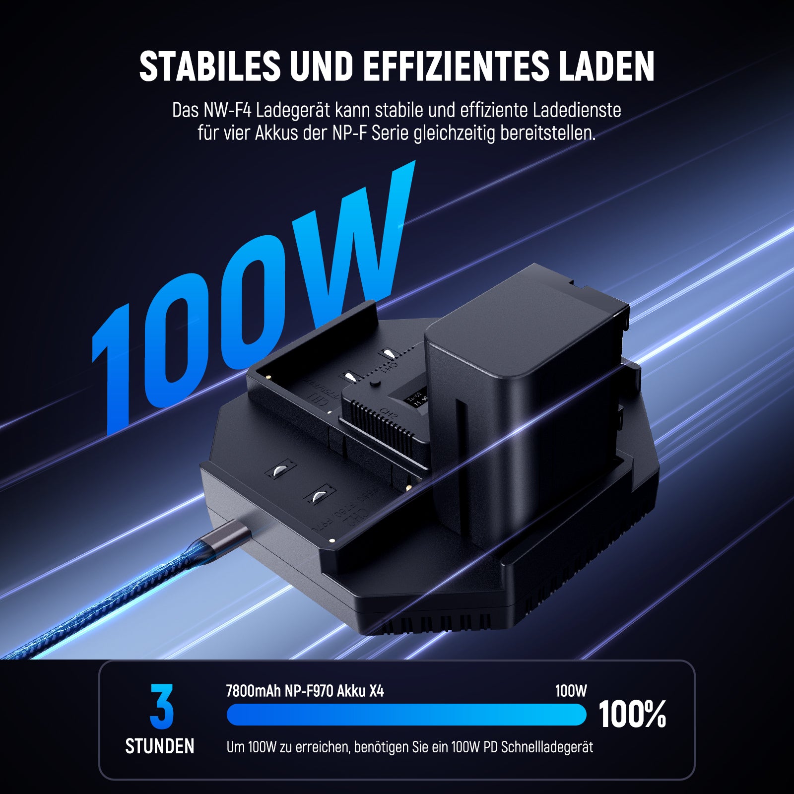 - 100W PD 4 Kanal Schnellladung- Der NW-F4 lädt effizient bis zu 4 NPF Batterien gleichzeitig auf. Er unterstützt 100W PD ultraschnelles Laden, wenn er mit einem 100W PD Ladegerät (separat erhältlich) verwendet wird, sodass vier 10500mAh NP-F970 Akkus in 4,5 Stunden oder vier 7800mAh NP-F970 Akkus in 3 Stunden vollständig aufgeladen werden können. Hinweis: Um die volle Leistung zu erreichen, wird dringend empfohlen, ein 100W PD Ladegerät oder höher zu verwenden
