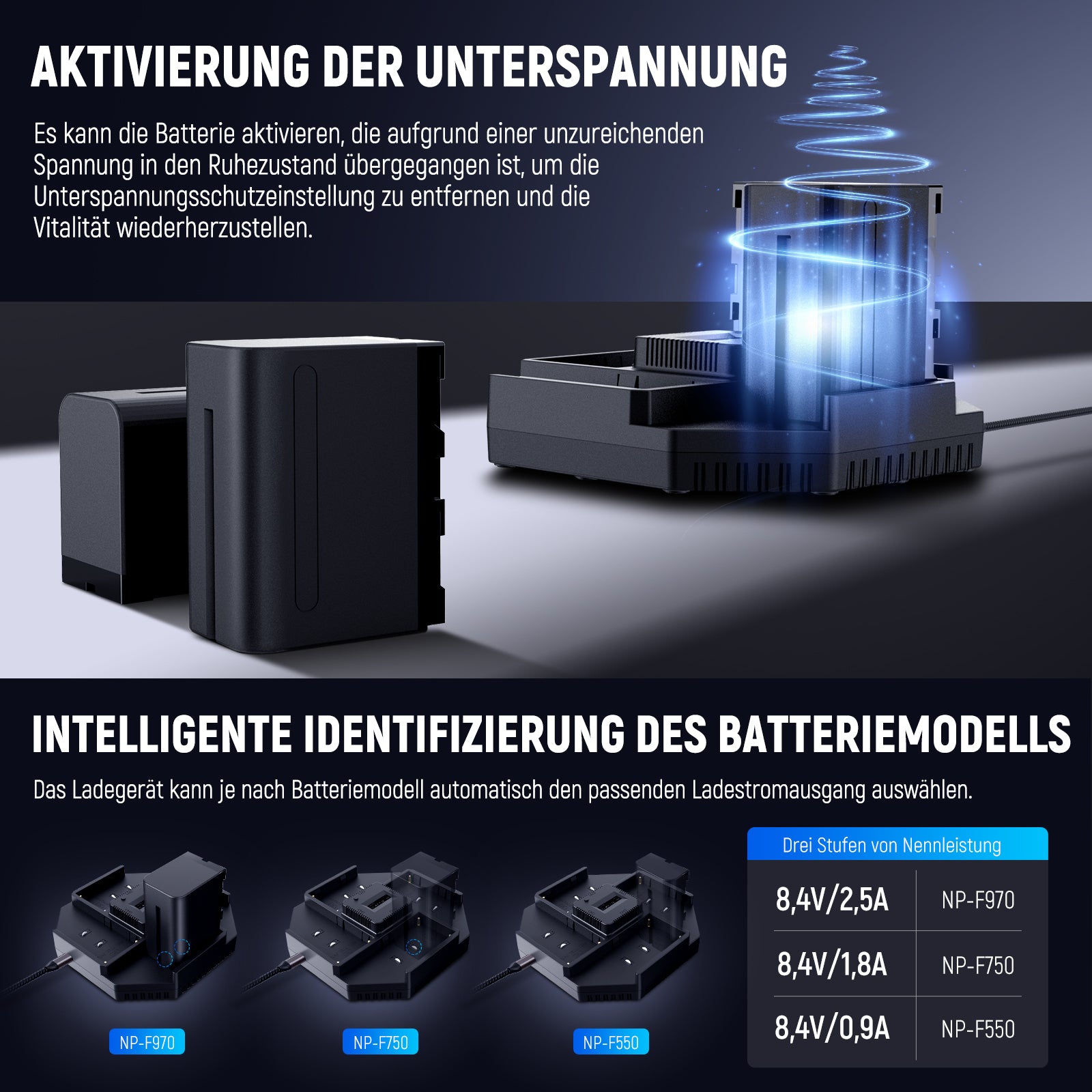 - Zuverlässiges Schutzsystem- Der F970 Batteriesatz ist mit einem fortschrittlichen Schutzsystem ausgestattet, um Überladung, Kurzschlüsse, Überhitzung, Überstrom, Überspannung und andere potenzielle Gefahren wirksam zu verhindern. Das Ladegerät verfügt über eine Unterspannungs Aktivierungsfunktion, die den Unterspannungsschutz bei Batterien, die aufgrund niedriger Spannung in den Ruhemodus gewechselt sind, aufhebt, um ihre volle Leistung wiederherzustellen