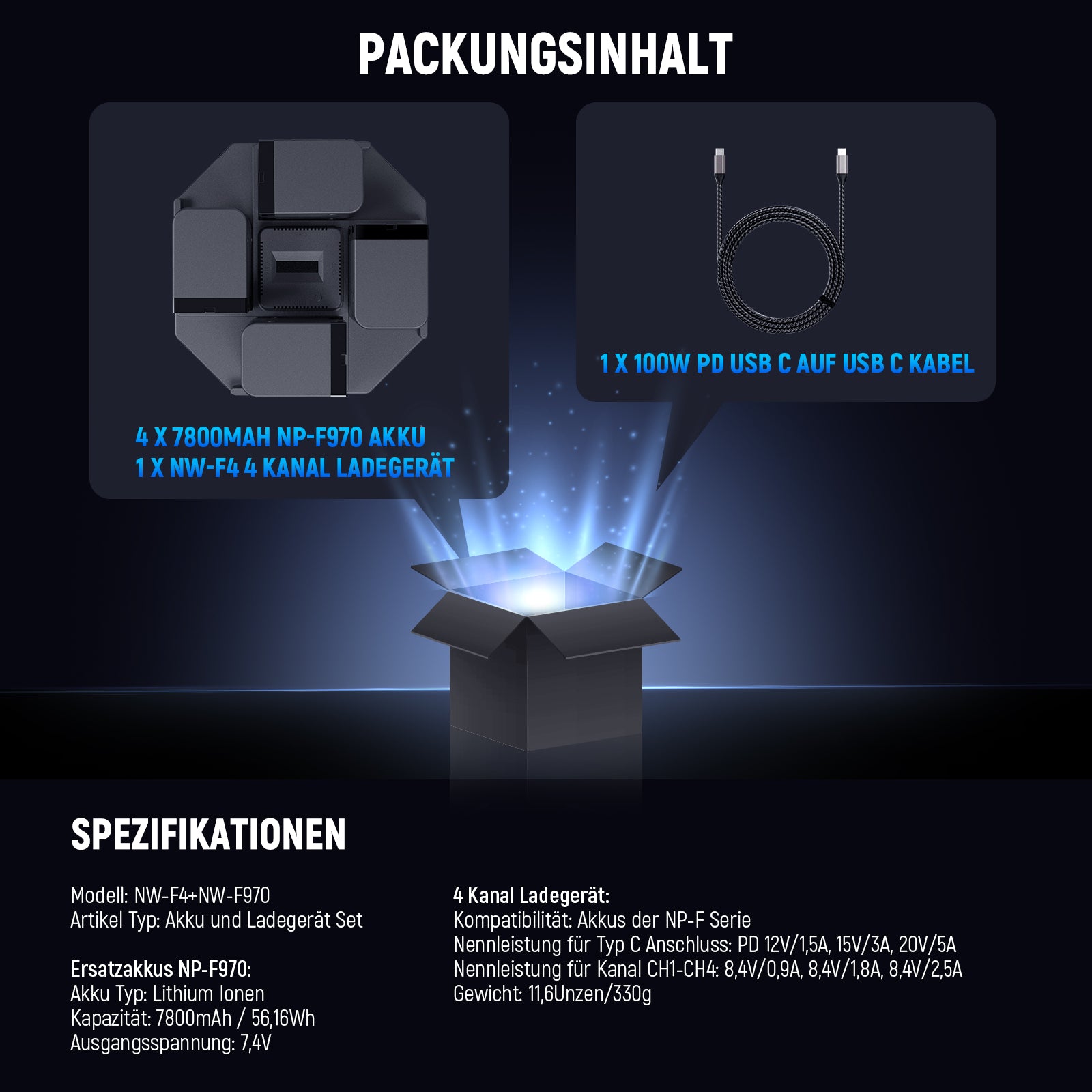 - 4 x 7800mAh NP-F970 Ersatzakku