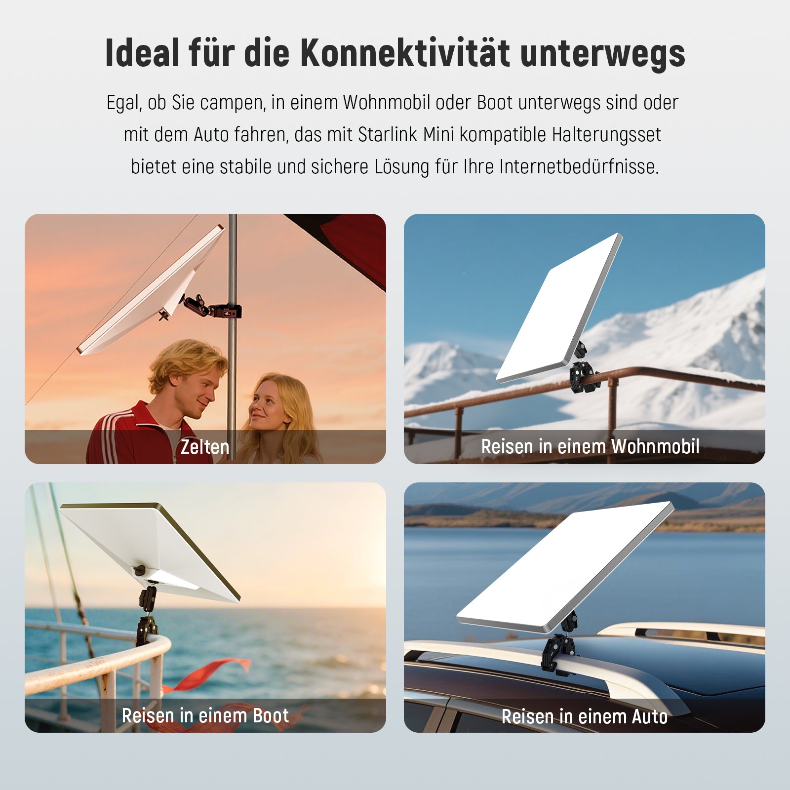 Ideale Konnektivität unterwegs- Egal, ob Sie campen, in einem Wohnmobil oder auf einem Boot unterwegs sind oder an einem abgelegenen Ort arbeiten, das mit Starlink Mini kompatible Halterungsset bietet eine stabile und sichere Lösung für Ihre Internetbedürfnisse. Sein vielseitiges Design und die einfache Installation machen es zu einem unverzichtbaren Zubehör für alle, die sich auf das Gerät für Hochgeschwindigkeits Internet an abgelegenen Orten verlassen