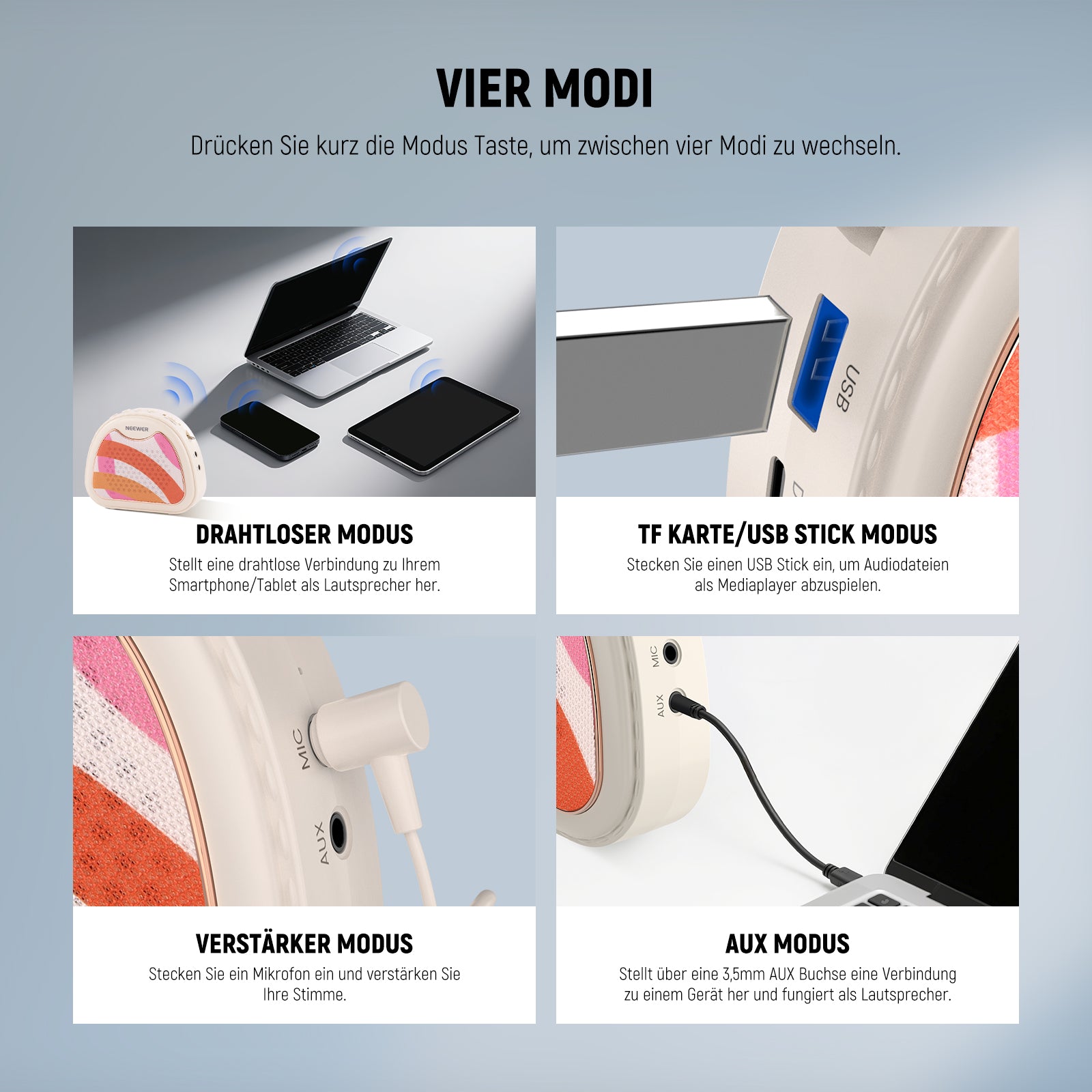 - Flash Laufwerk/Bluetooth/AUX Modi- Dieses Gerät ist nicht nur ein Voice Amplifier mit Headset Mikrofon System, sondern auch ein eigenständiger Lautsprecher und unterstützt drei Modi: 1) Der USB A Anschluss ermöglicht die direkte Audiowiedergabe von USB Stick. 2) Die Bluetooth Konnektivität ermöglicht kabelloses Audio Streaming von Smartphones, Tablets, Computern. 3) Der 3,5mm TRS AUX Eingang ermöglicht den kabelgebundenen Anschluss externer Audioquellen (Kabel nicht im Lieferumfang enthalten)