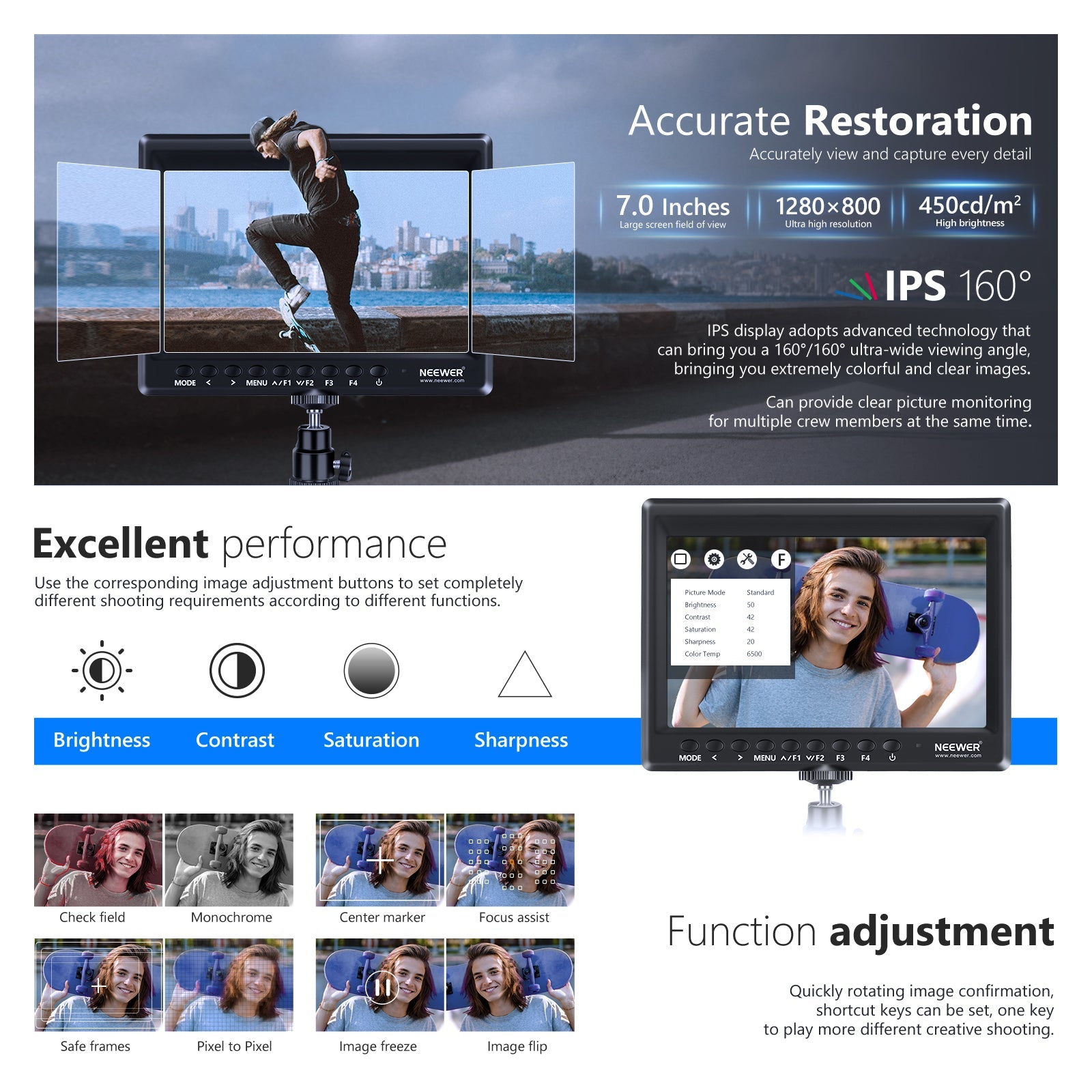 - 【Externer Feldmonitor】Mit seinem 7Zoll Weitwinkel IPS Panel und 17mm ultraflachem Design mit LED Hintergrundbeleuchtung, einer HD Auflösung von 1280 x 800, einer Helligkeit von 450cd/m², einem Kontrastverhältnis von 1200:1 und einem Seitenverhältnis von 16:10 ist dieser Monitor ideal für Videoaufnahmen