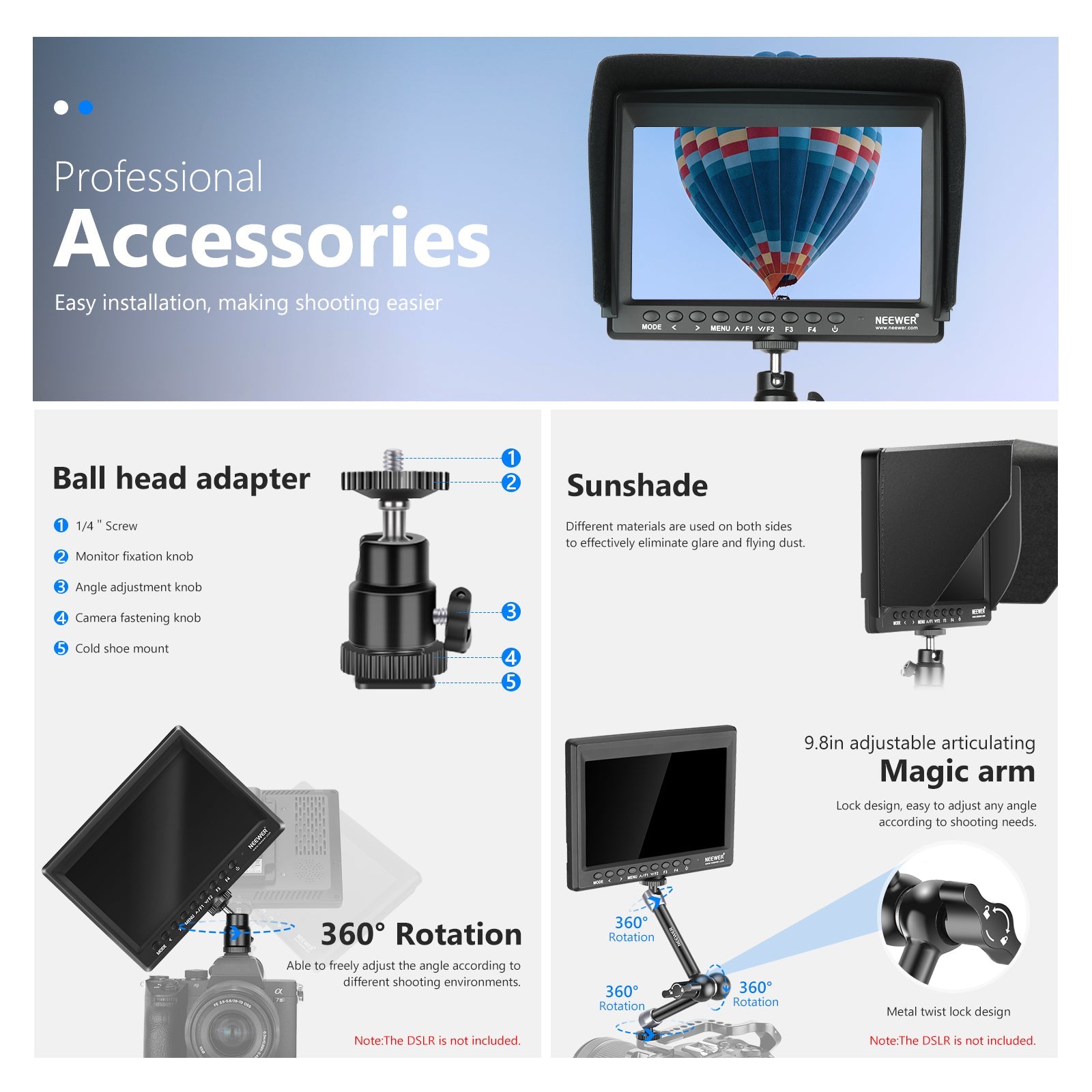 - 【Lieferumfang】NEEWER F100 Field Monitor, Mini HDMI Kabel, Micro HDMI Kabel, Sonnenschirm, Mini Kugelkopf, AV Kabel, 11" Magic Arm, NP F550 2600mAh wiederaufladbarer Li Ionen Akku, NP F550 USB Ladegerät, Benutzerhandbuch