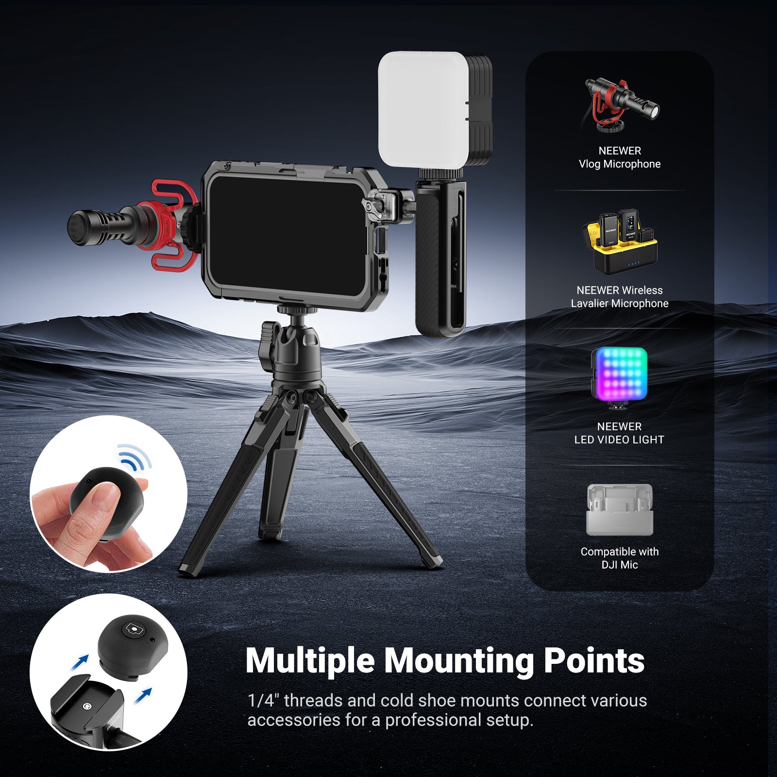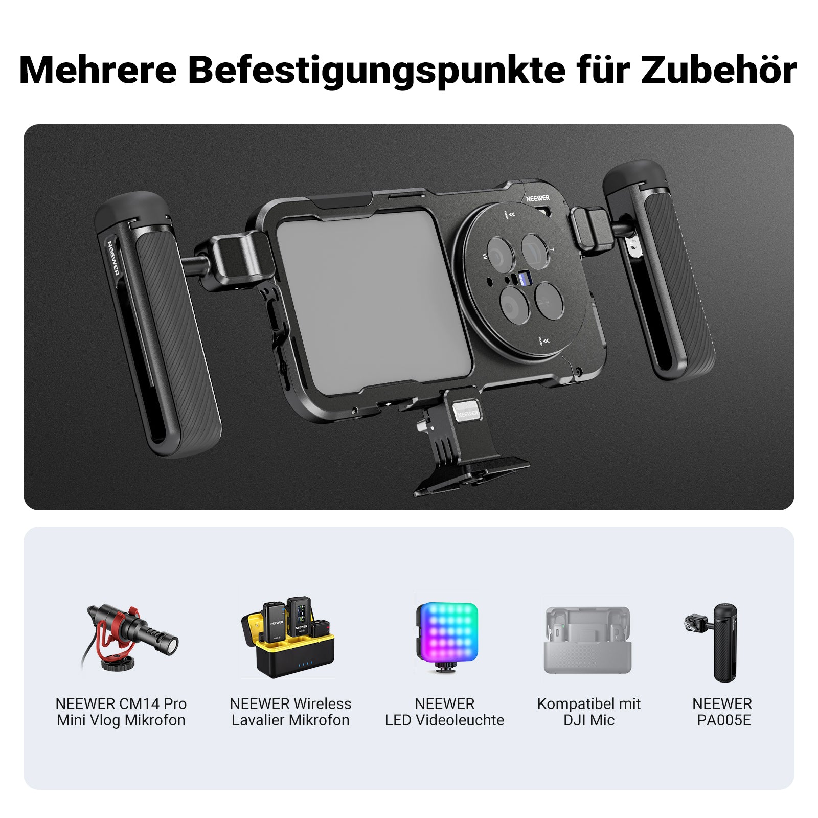 NEEWER Smartphone-Käfige bieten mehr Stabilität und flexible Montagemöglichkeiten für Foto- und Videoaufnahmen. Der feste Rahmen reduziert Verwacklungen und ermöglicht kontrollierteres Filmen sowie die Befestigung von Zubehör wie Leuchten und Mikrofonen.
