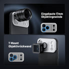 - T Mount Objektivrückwand- Kompatibel mit mobilen Objektiven der Moment T Serie, darunter anamorphotische Objektive, Makroobjektive mit 10 facher Vergrößerung, Teleobjektive mit 58mm Brennweite, Weitwinkelobjektive mit 18mm Brennweite und Fischaugenobjektive mit 14mm Brennweite (Hinweis: Objektive sind separat erhältlich. Entfernen Sie das montierte Objektiv, bevor Sie die Rückwand abnehmen