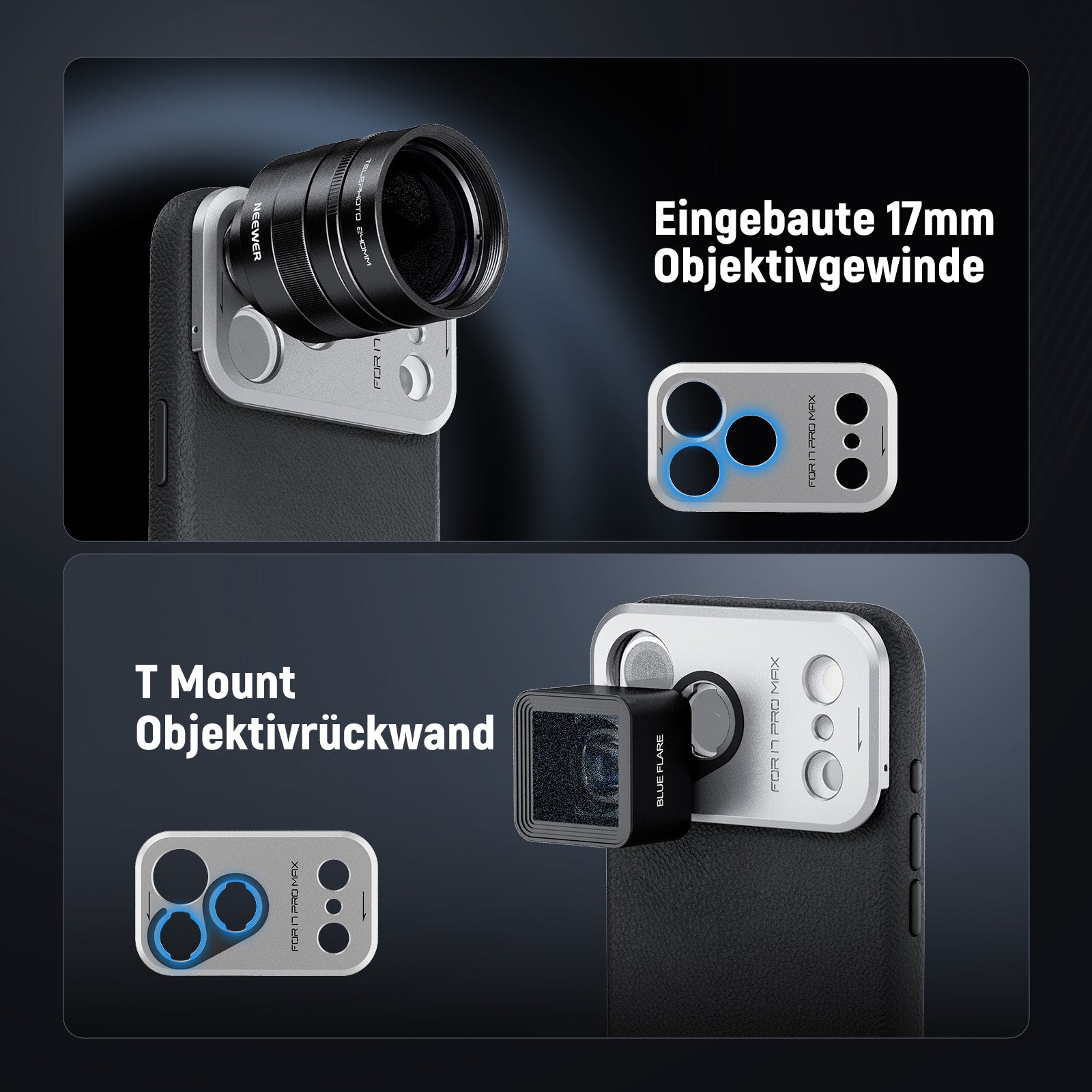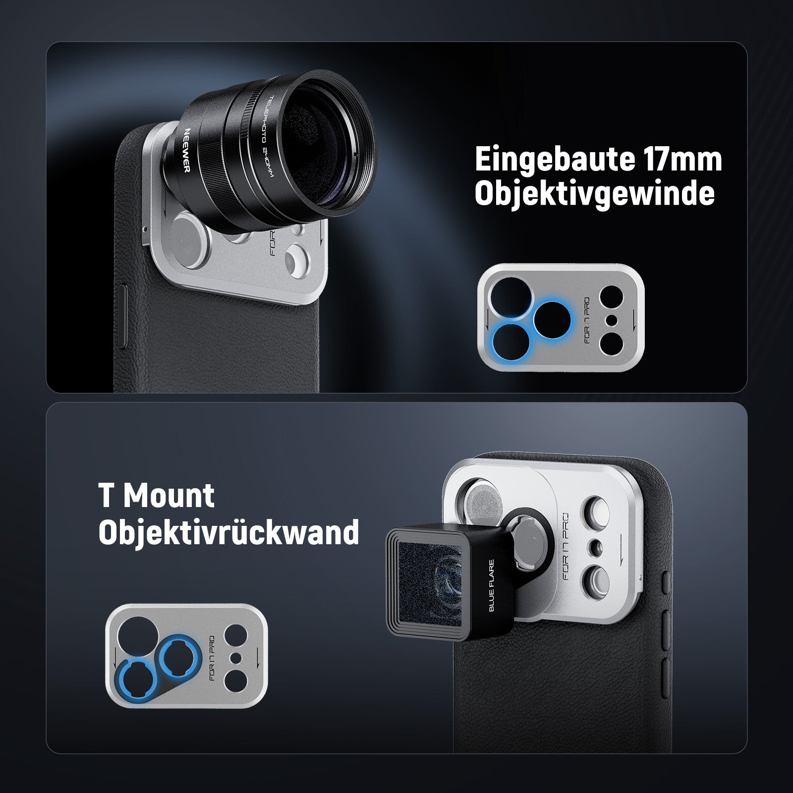 - 17mm Handyobjektiv Rückplatte- Entwickelt für Haupt und Teleobjektive, passt sie auf alle NEEWER Handyobjektive mit 17mm Gewinde, darunter 105mm Makro, 10 fach Makro, 8mm Fischauge, 45 fach Mikroskop, 7 fach Tele, 18mm Weitwinkel und 1,55 fach Blau Anamorphot (Hinweis: Objektive sind separat erhältlich. Entfernen Sie das montierte Objektiv, bevor Sie die Rückplatte abnehmen