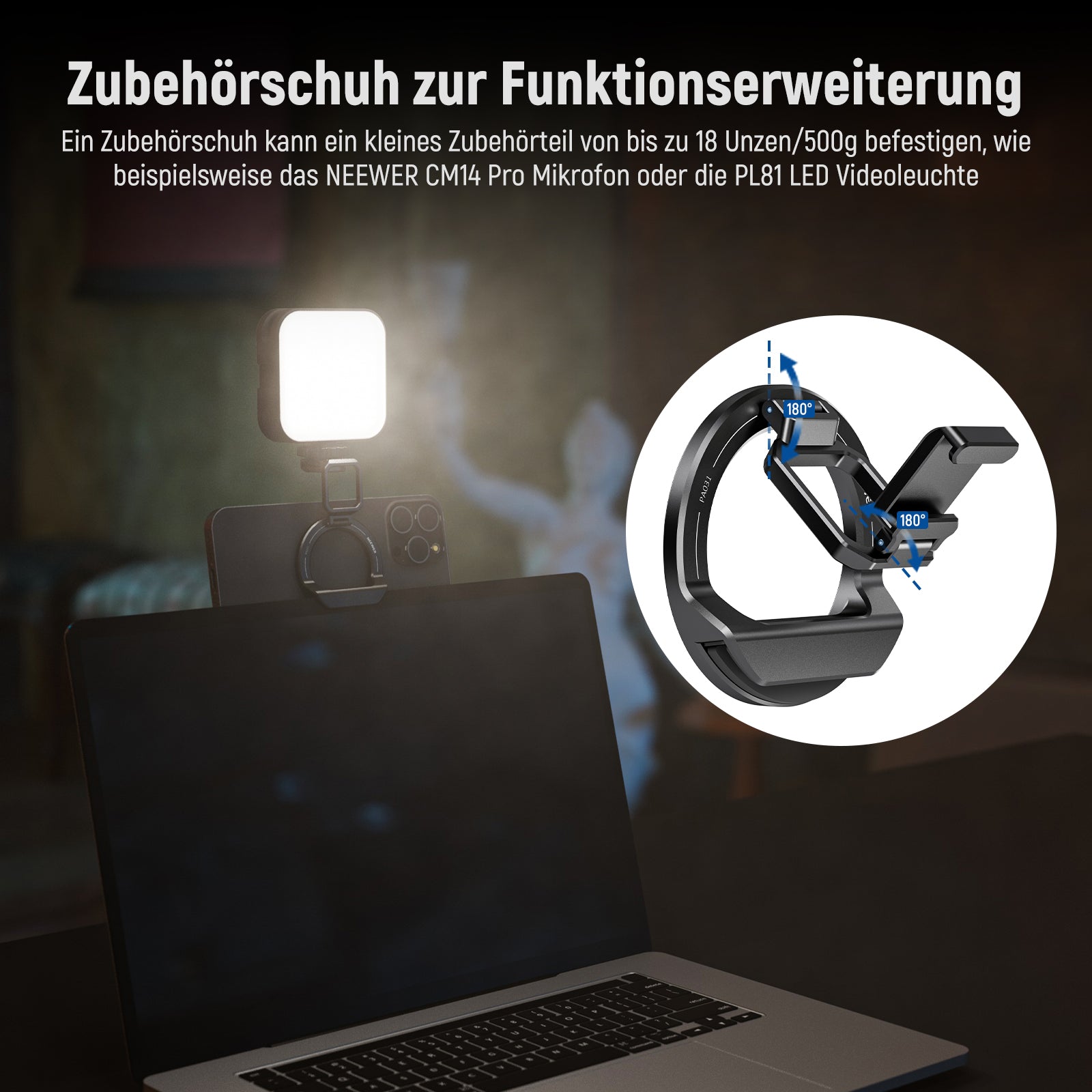 - Zubehörschuh zur Funktionserweiterung- Ein Zubehörschuh kann ein kleines Zubehörteil von bis zu 500g wie NEEWER CM14 Pro Mikrofon oder die NL-36AI LED Videoleuchte für Zoom Anrufe, Online Kurse, Live Streaming und Videokonferenzen befestigen. Es dient auch als Tischständer für das Ansehen von Videos