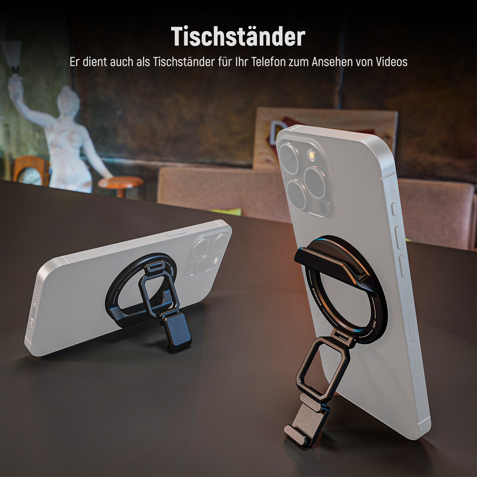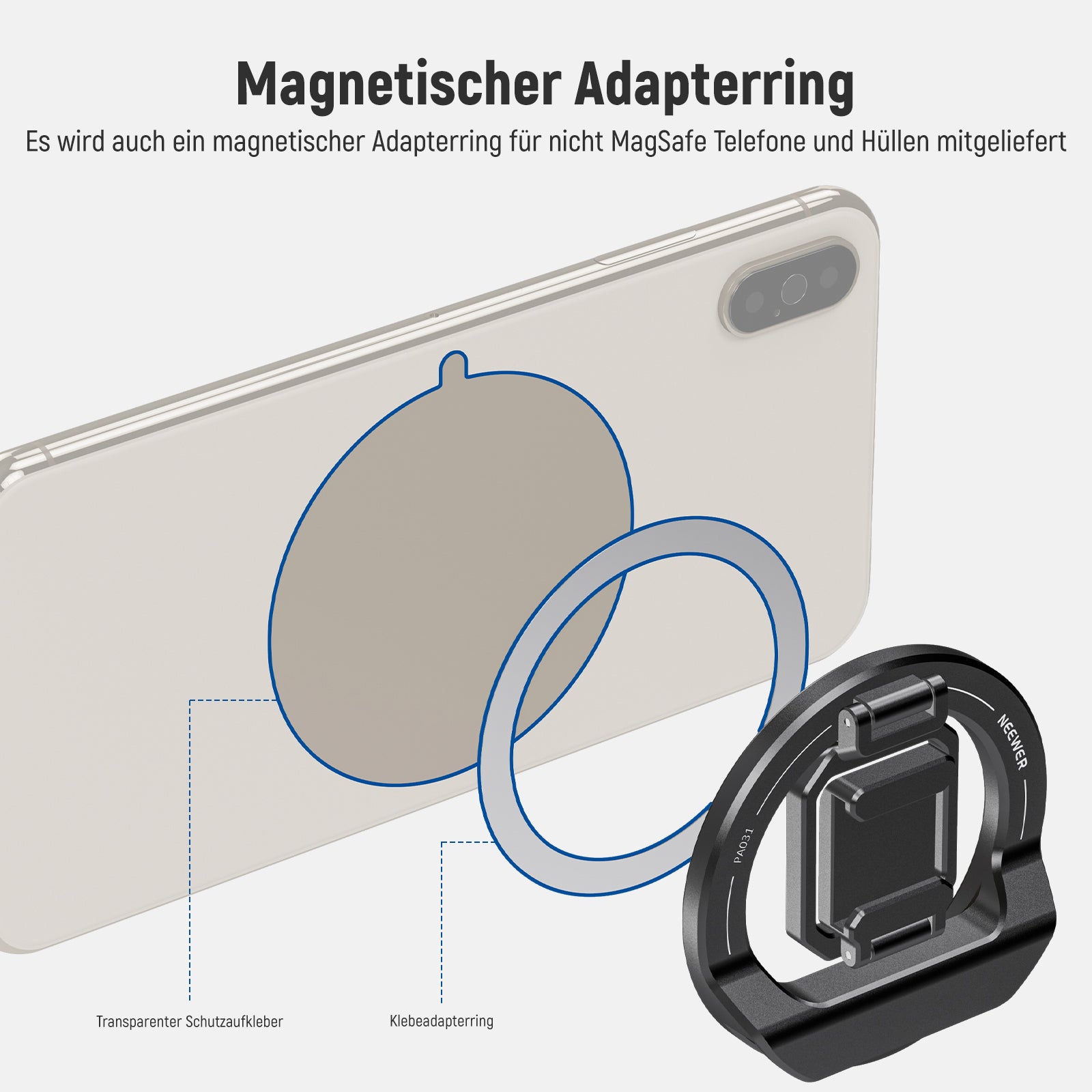 - Magnetischer Klebeadapterring- Bei Telefonen und Hüllen, die nicht mit MagSafe kompatibel sind, können Sie zuerst den mitgelieferten magnetischen Klebeadapterring darauf kleben und dann diese Webcam Halterung anbringen