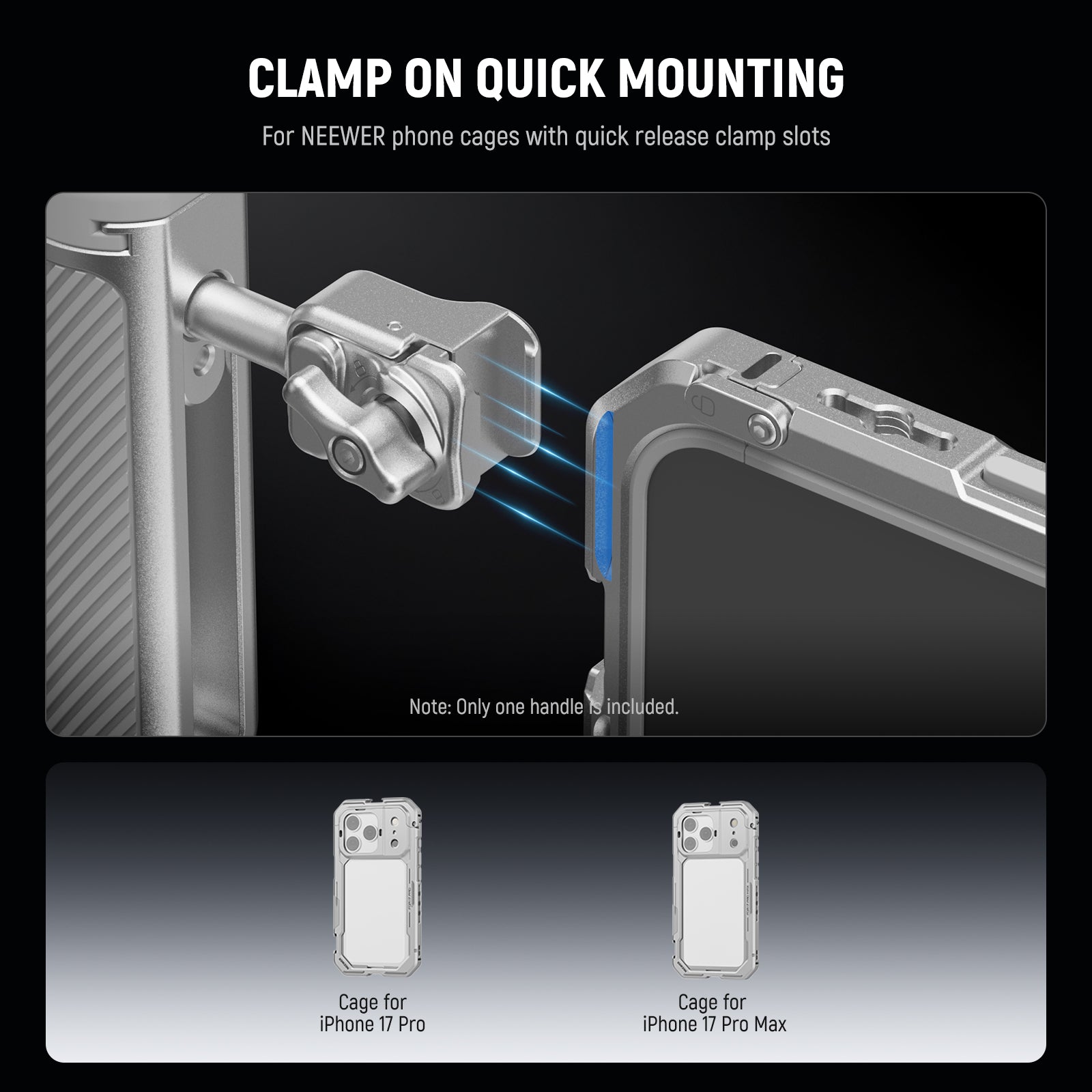 - Schnellspanner Montage an der Klemme- Der Seitenhandgriff verfügt über eine Schnellspannklemme und lässt sich schnell am Telefonkäfig befestigen und durch Drehen des Verriegelungsknopfes sichern - perfekt für Videoaufnahmen im Freien, Filmemachen, Vlogging, Live Streaming, mobile Fotografie und andere Aktivitäten, bei denen die Zeit knapp ist