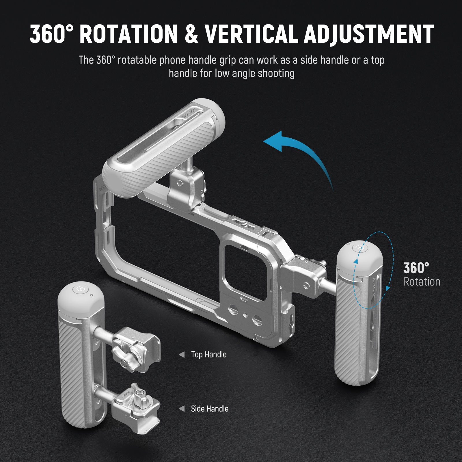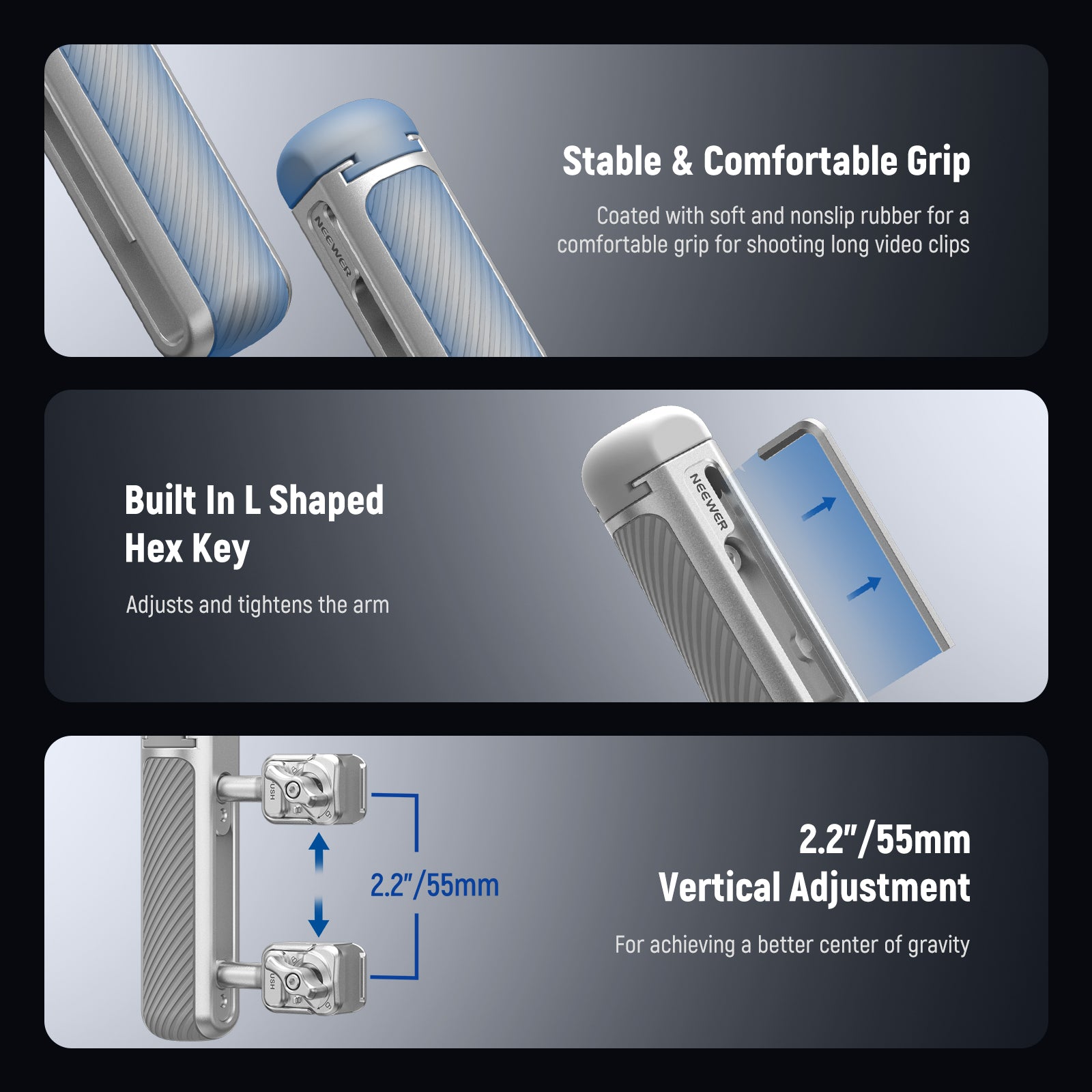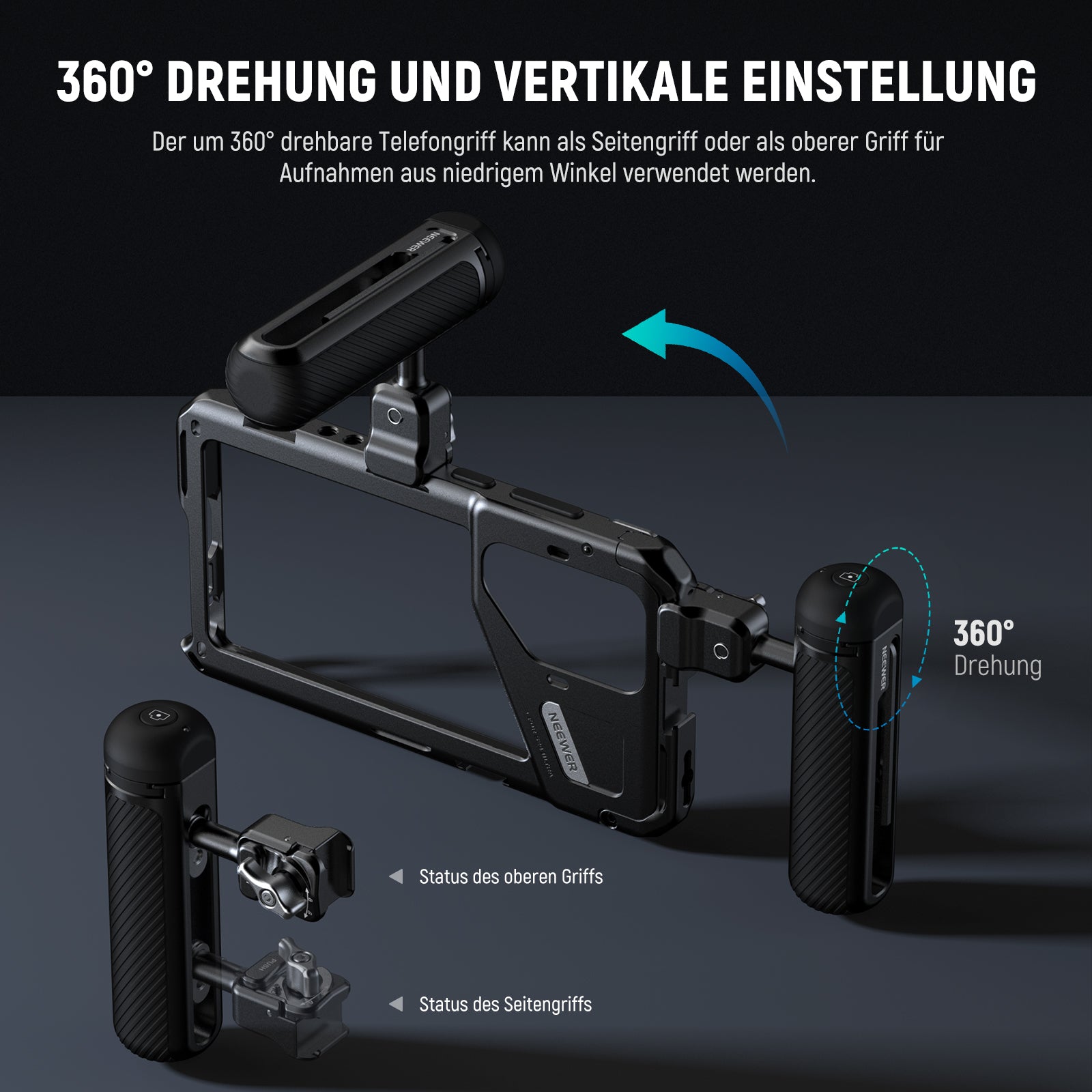 - 360° schwenkbar und vertikal einstellbar- Durch die 360° Drehung kann der Smartphone Side Handle auch als oberer Griff für Aufnahmen aus niedriger Perspektive verwendet werden. Die 2,2"/55mm vertikale Einstellung ermöglicht eine bessere Balance