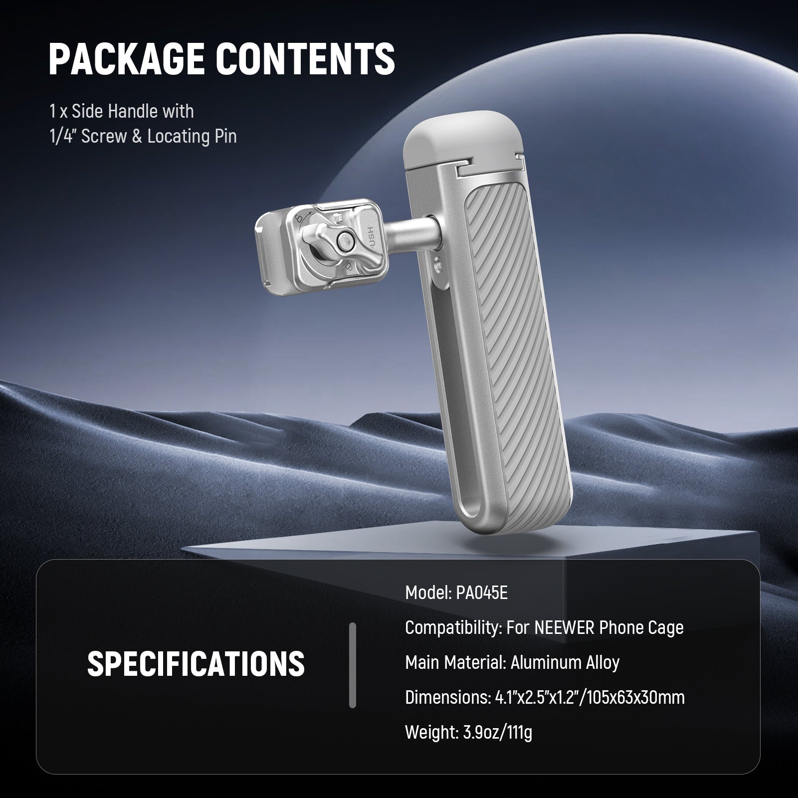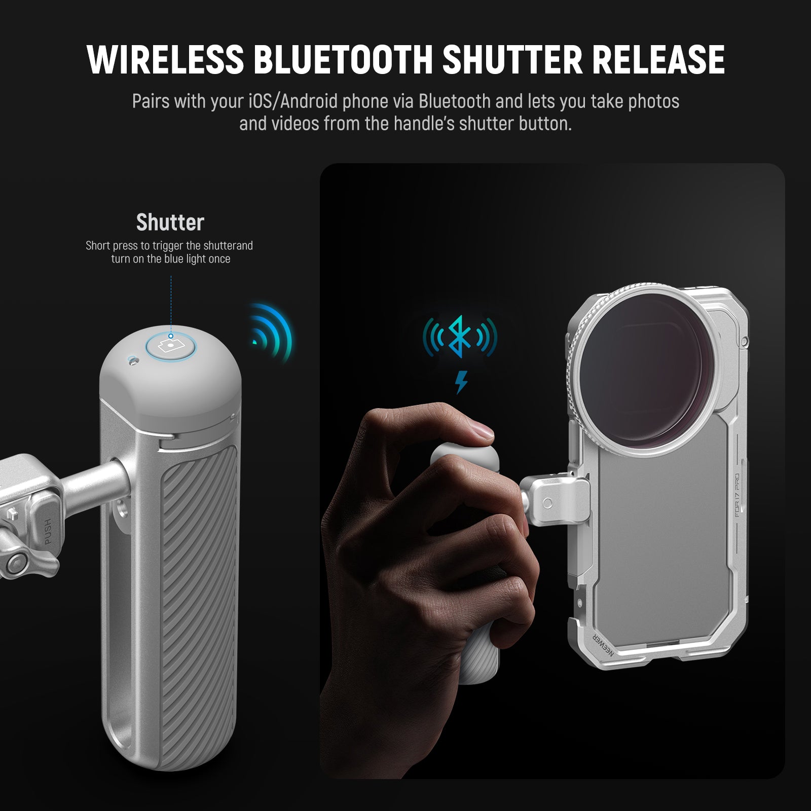 - Für NEEWER Telefonkäfige der 2. Generation- Dieser seitliche Griff mit Bluetooth Auslöser ist für NEEWER Telefonkäfige mit Schnellspannklemmen Montageschlitzen konzipiert, einschließlich PA043/PA044 Phone käfig der 2. Generation für 15 Pro/15 Pro Max und PA042 Video Rig Cage für Galaxy S24 Ultra