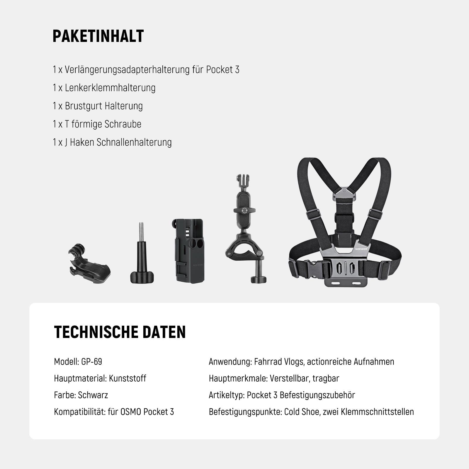 - Tragbar für Aufnahmen unterwegs- Einmal an der Brust oder am Lenker befestigt, bietet dieses Halterungs Kit für Pocket 3 ein immersives Videoaufnahmeerlebnis der Landschaft unterwegs, ohne dass Sie die Kamera selbst halten müssen. Konzentrieren Sie sich einfach auf Ihre Inhalte für ein müheloses Aufnahmeerlebnis beim Radfahren, Mountainbiken, Wandern usw.