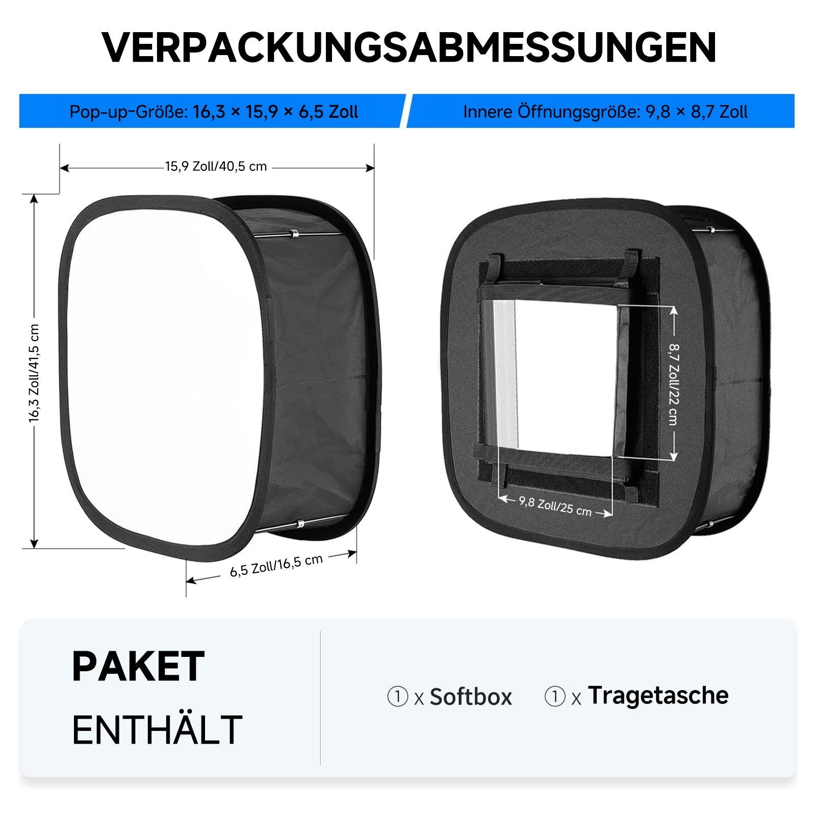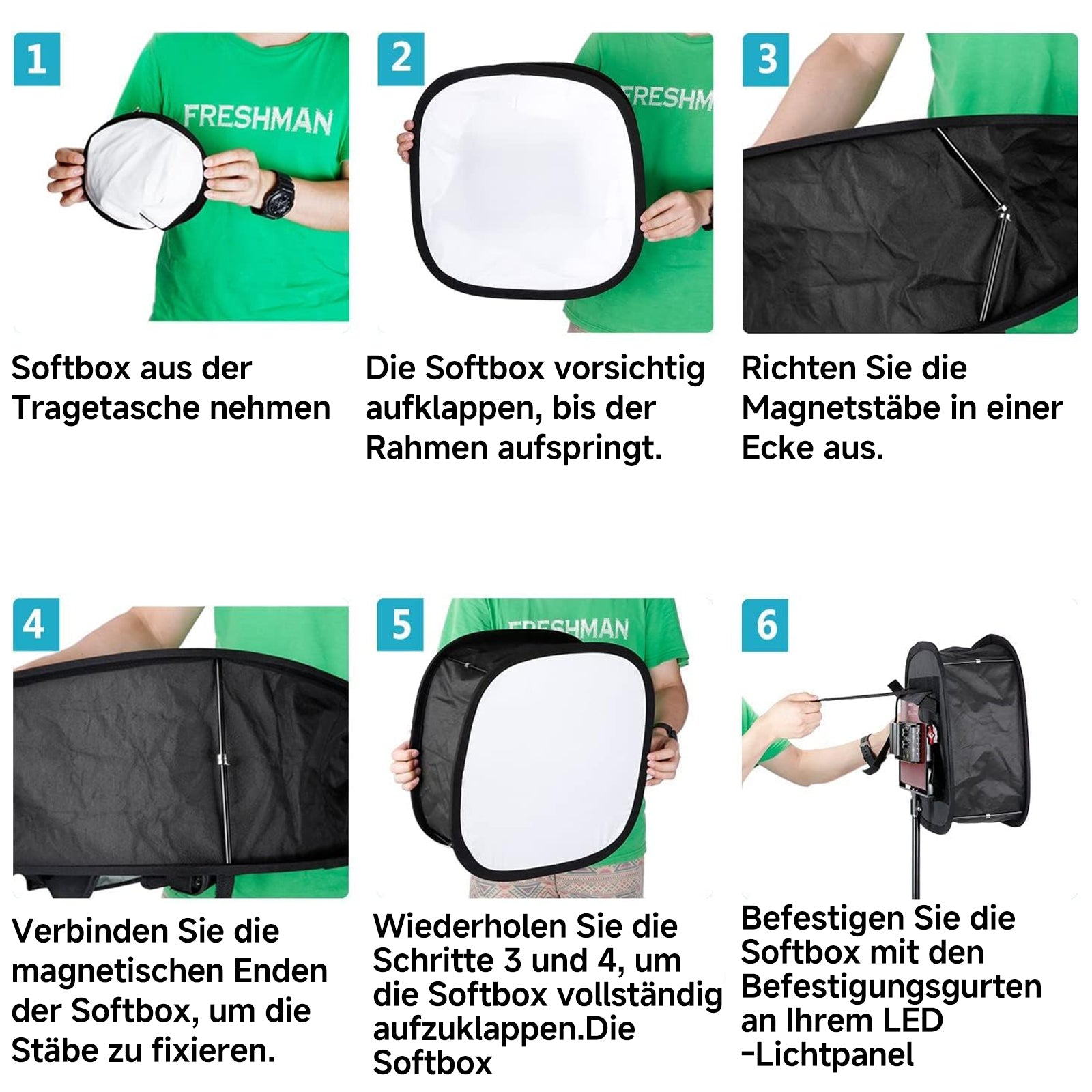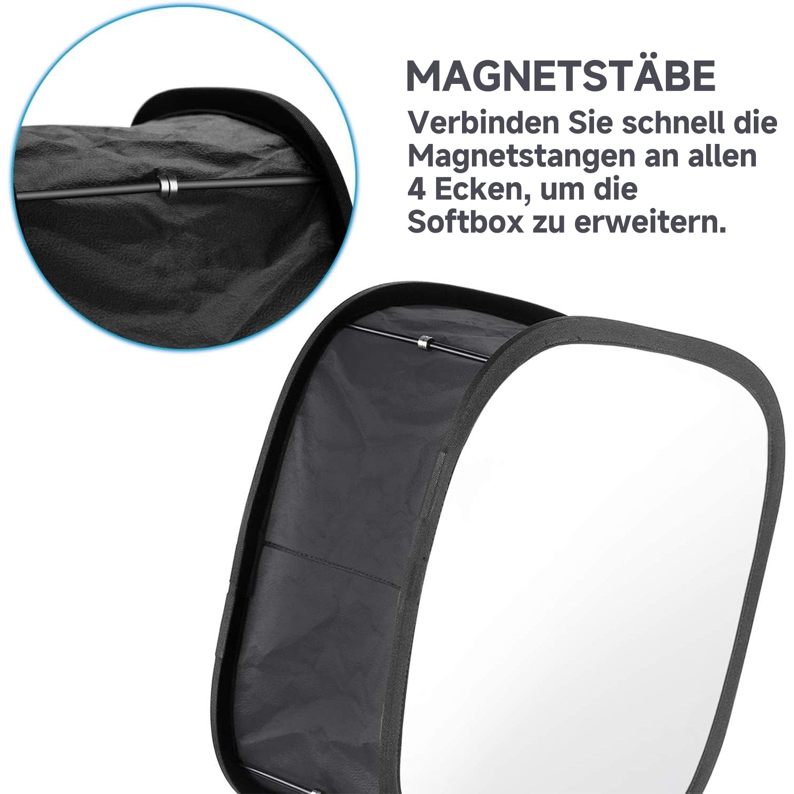 - Praktische Magnetverbindungen: Die Magnetverbindungen bieten Flexibilität beim einfachen Biegen oder vollständigen Ausziehen der Softbox.