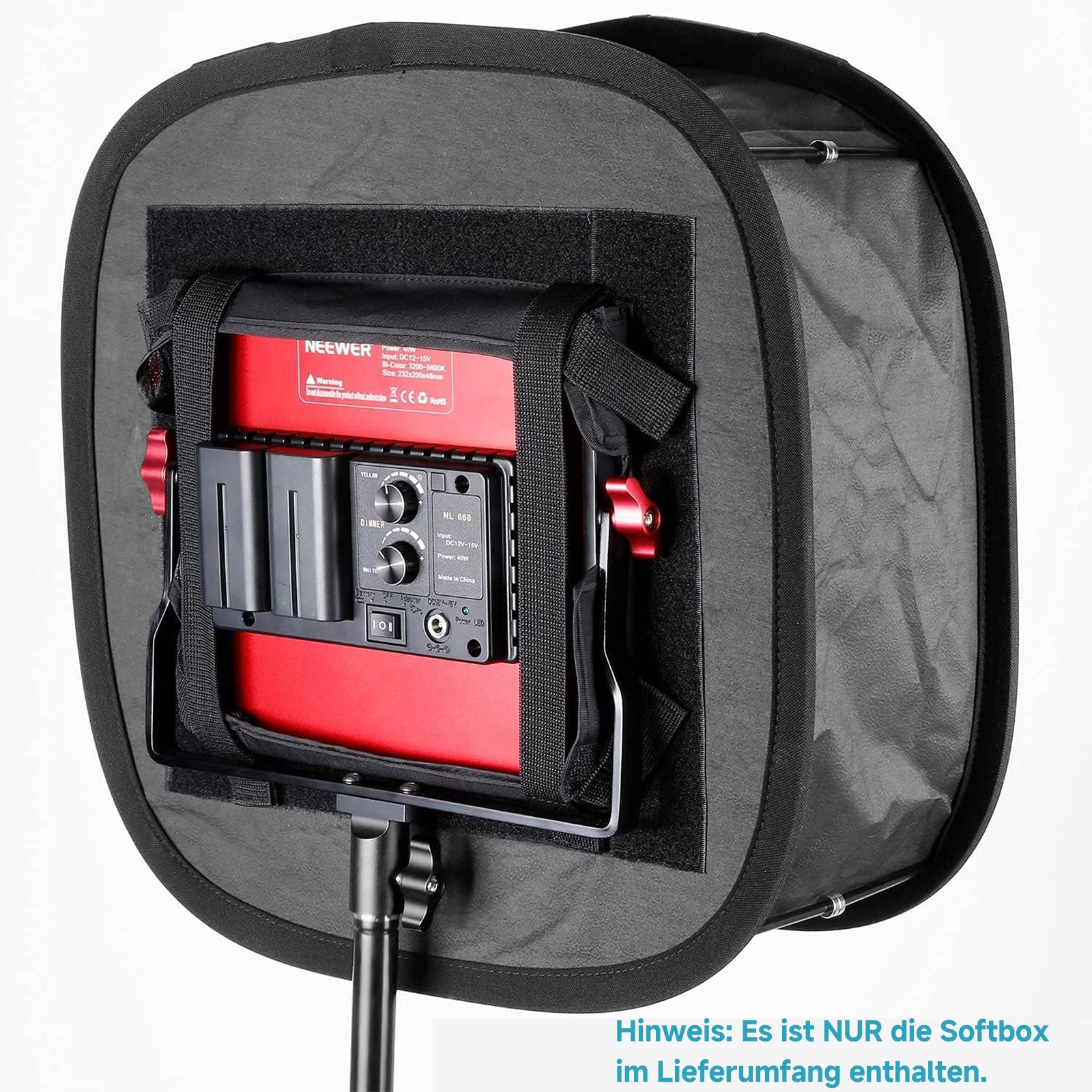 - Spezielles Design für 660 LEDs: Diese langlebige Softbox in kompakter Größe, die fest mit dem 660 LED Lichtpanel verbunden werden kann, wird verwendet, um harte Blitzlichter weicher zu machen und Schattenwurf auf dem Objekt während der Fotografie zu reduzieren.