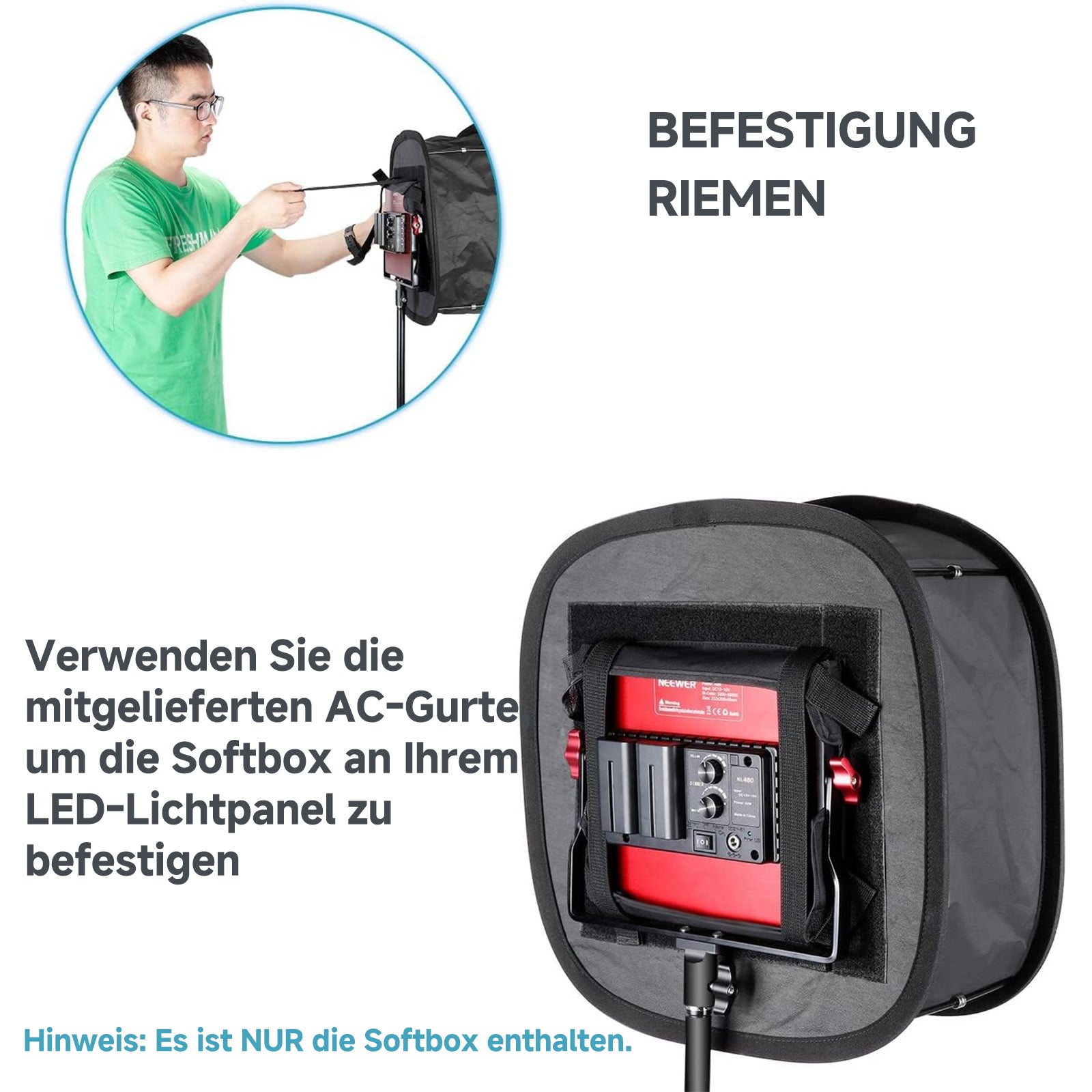 - Einfache Montage durch Befestigungsbänder: Öffnen Sie und ziehen Sie die Softbox vollständig aus durch die 4 magnetischen Stäbe an jeder Ecke; die Softbox wird mit einem LED-Licht über die Befestigungsbänder sicher und fest verbunden, Sie müssen sich keine Sorgen um ein unerwartetes Herabfallen des LED-Lichts machen.
