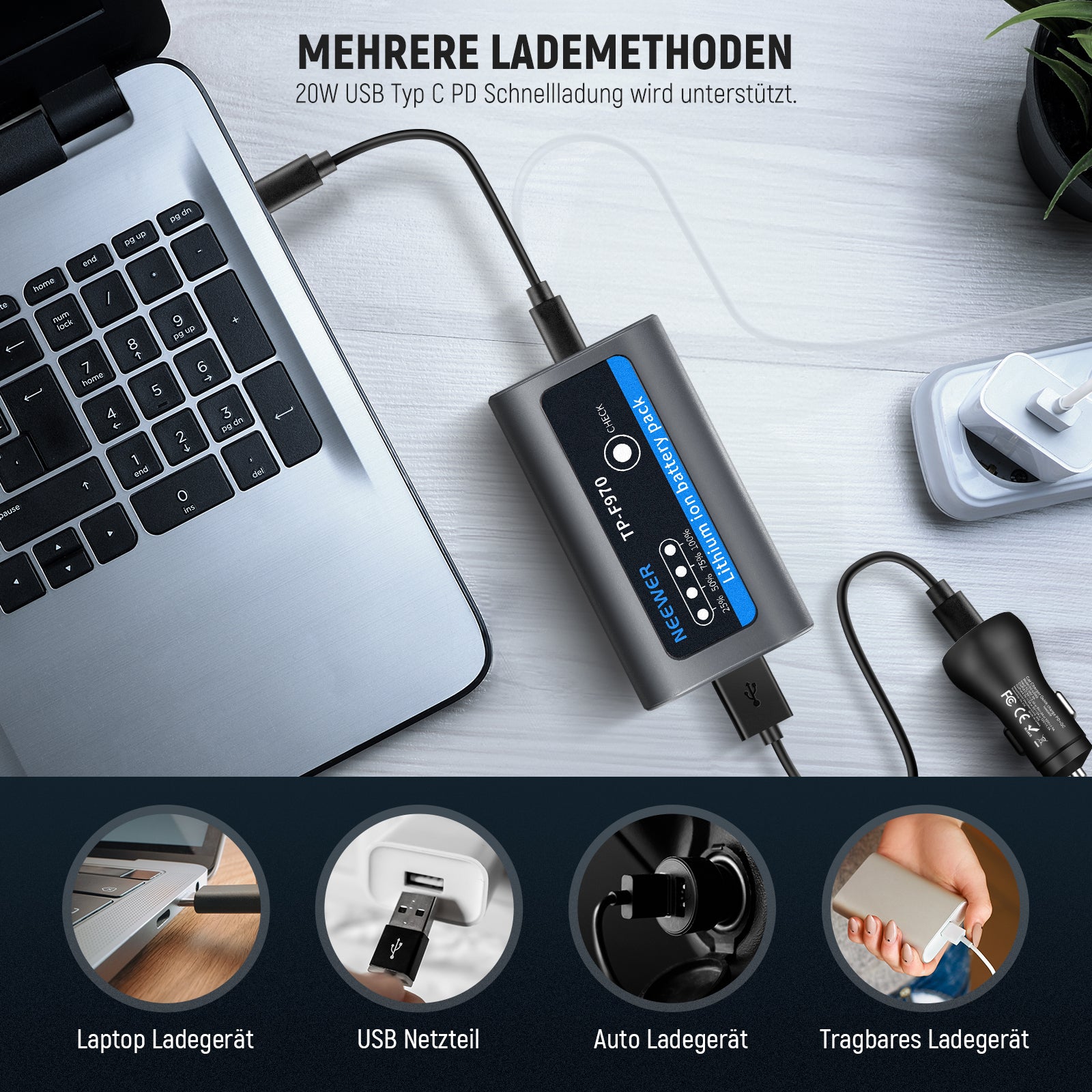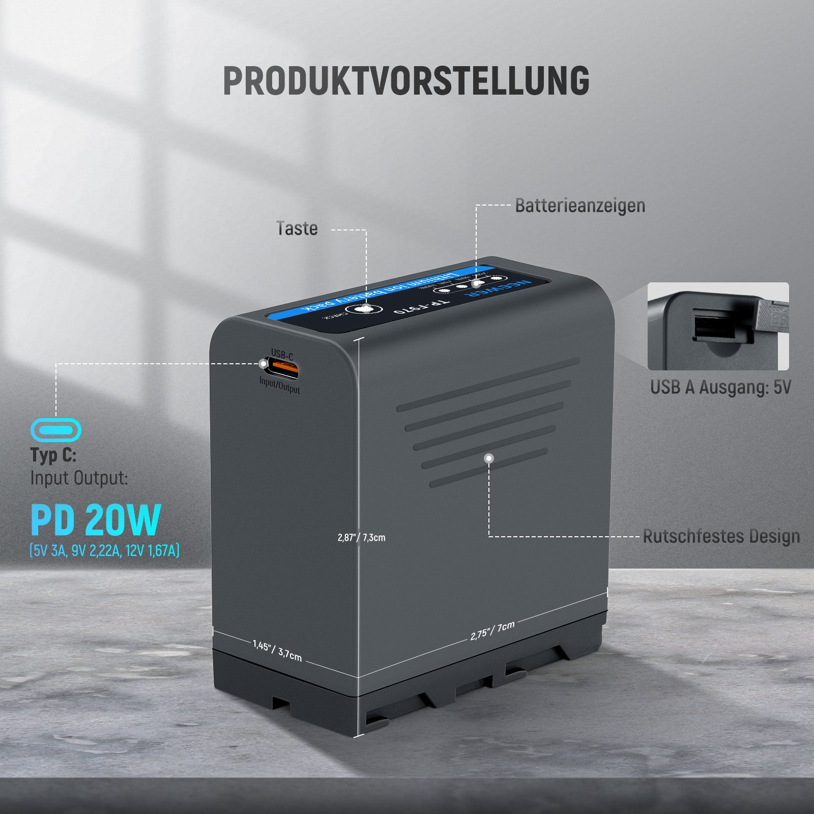 - 4,8 Stunden vollständige Ladezeit mit PD 20W Schnellladung- Dieser wiederaufladbare NP-F970 Akku verfügt über einen bidirektionalen USB Typ C Ein/Ausgangsanschluss, der 20W PD Schnellladung unterstützt. Das vollständige Aufladen des Akkus dauert über ein Wandladegerät nur 4,8 Stunden! Ein USB Typ C Schnellladekabel ist im Lieferumfang enthalten. PD 20W Wandladegerät ist NICHT im Lieferumfang enthalten