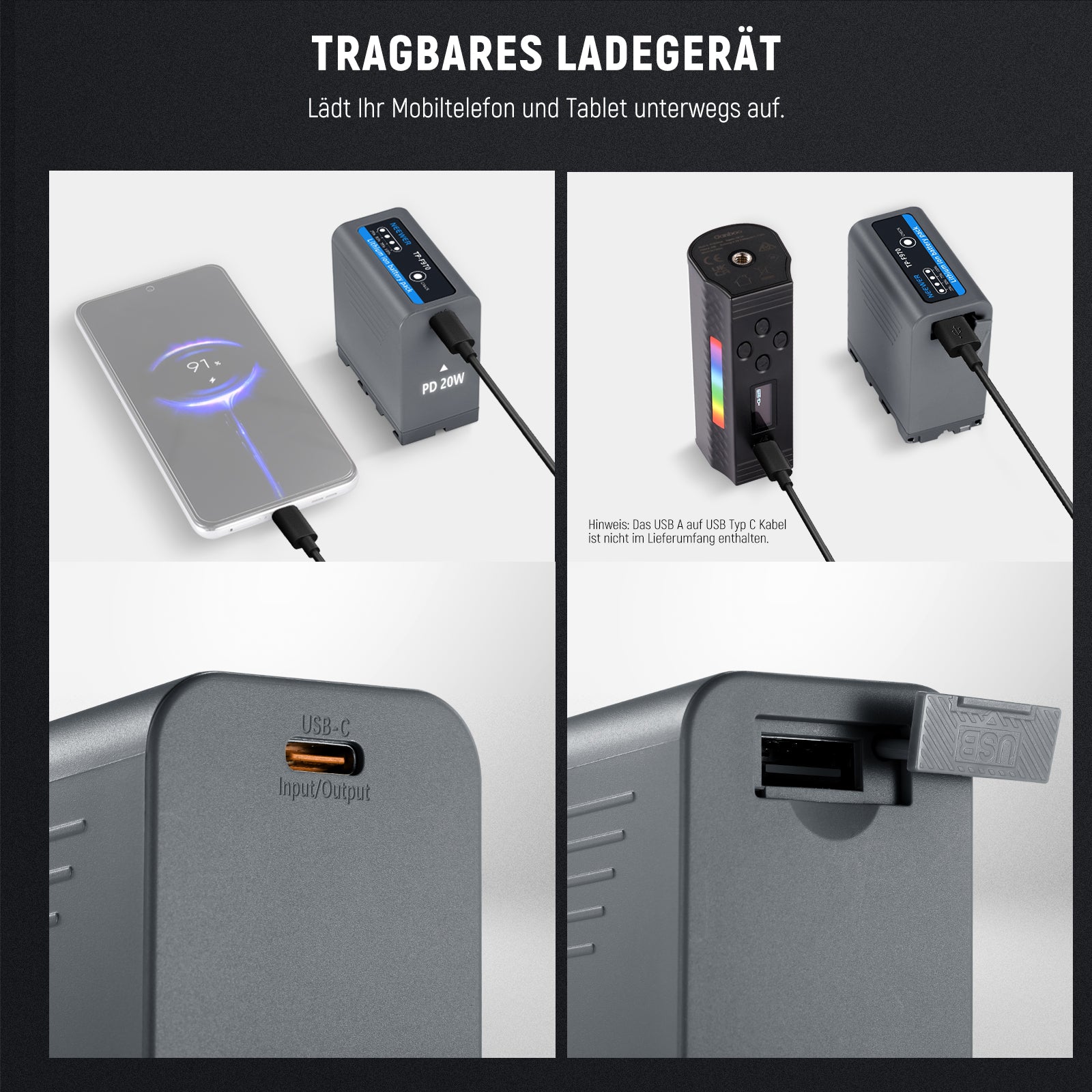 - 10500mAh Kapazität für ausreichend Leistung- Dieser Lithium Ersatzakku NP-F mit Premium Zellen verfügt über eine hohe Kapazität von 10500mAh (7,2V, 76,34Wh) und sorgt für reichlich Akkuleistung für konsistente Fotoprojekte und Videoproduktionen. Es ist eine tragbare Stromversorgung zur Unterstützung Ihres Geräts, damit Sie unterwegs jeden schönen Moment festhalten können. Darüber hinaus verfügt der Akku NP-F970 auch über einen USB A Anschluss mit 5V Ausgang zum Aufladen von Handys und Tablets