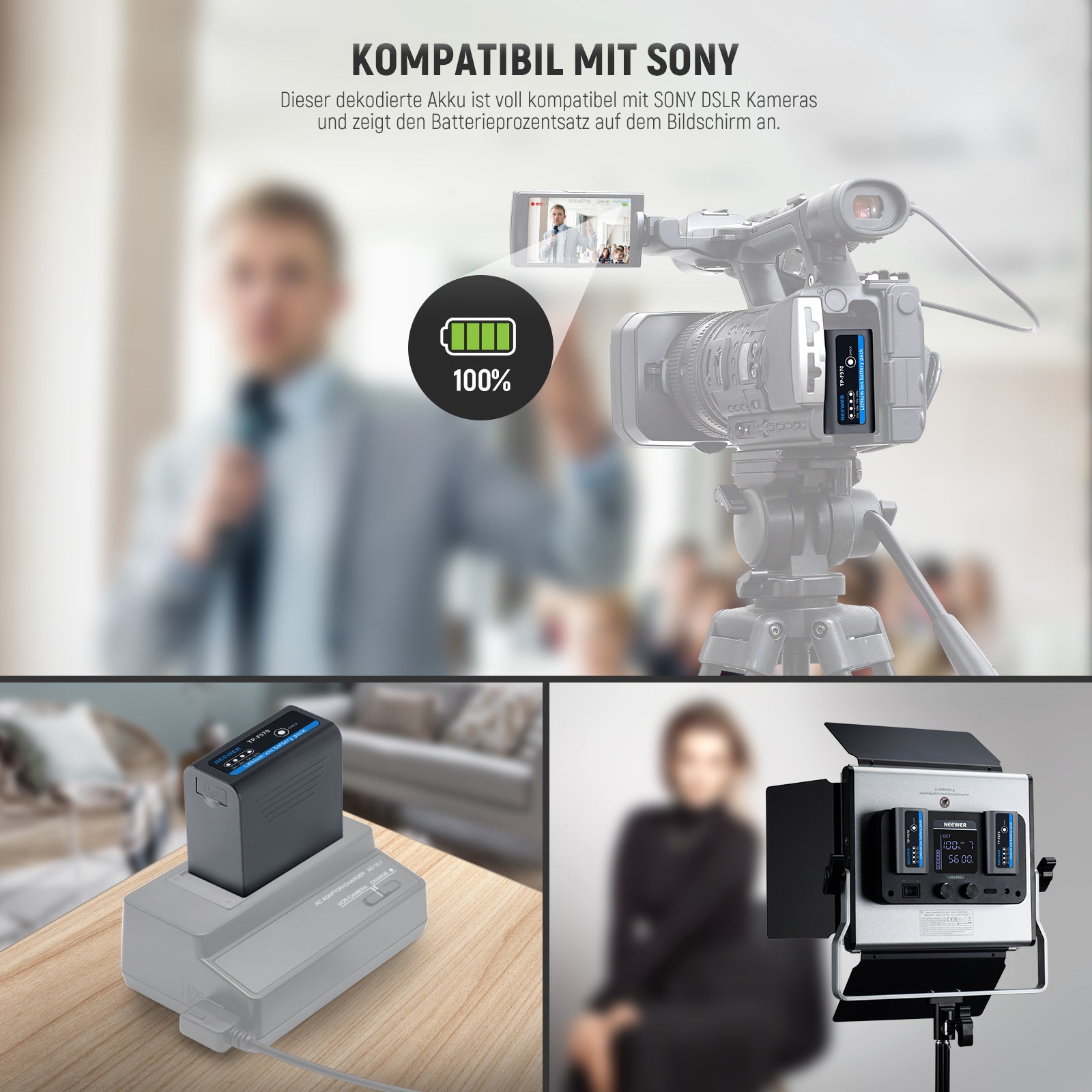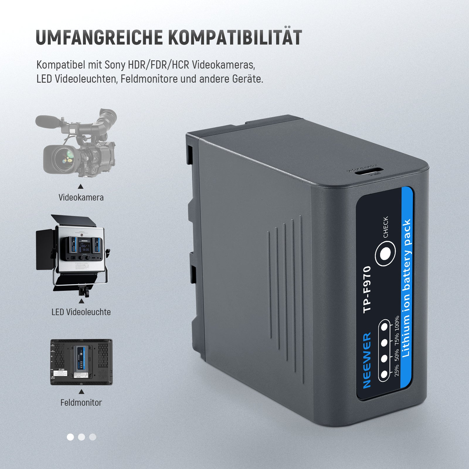 - Kompatibel mit verschiedenen Geräten- Ein Ersatz Akku für alle Batterien der NP-F Serie, einschließlich NP-F550, NP-F570, NP-F750, NP-F770, NP-F960, NP-F970, NP-F975. Kompatibel mit Sony Handycams, Sony DCR-VX2100, DSR-PD150, DSR-PD170, FDR-AX1, HDR-AX2000, HDR-FX1, HDR-FX7, HDR-FX1000, HVL-LBPB, HVR-HD1000U, HVR-V1U, HVR-Z1P, HVR-Z1U, HXR-MC2000U, MVC-FDR1, NEX-EA50UH, NEX-FS100U, NEX-FS700U Serie Kameras und Camcorders, NEEWER LED Panel Lichter, Ring Lichter und Feldmonitore