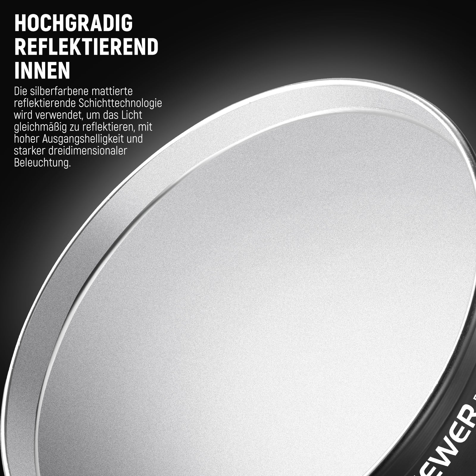 Robuste Aluminiumlegierung und hochreflektierendes Futter- Der Reflektor Lampenschirm und die Wabengitter sind aus einer leichten, aber robusten Aluminiumlegierung gefertigt und gewährleisten langlebige professionelle Lichtanforderungen mit effizienten Lichtsteuerungsmöglichkeiten. Der Innenraum besteht aus einer hochreflektierenden, mattierten Textur, die die Lichtleistung sanft verteilt und so direktes Licht und grelle Blendung reduziert, ohne die Lichtintensität zu beeinträchtigen