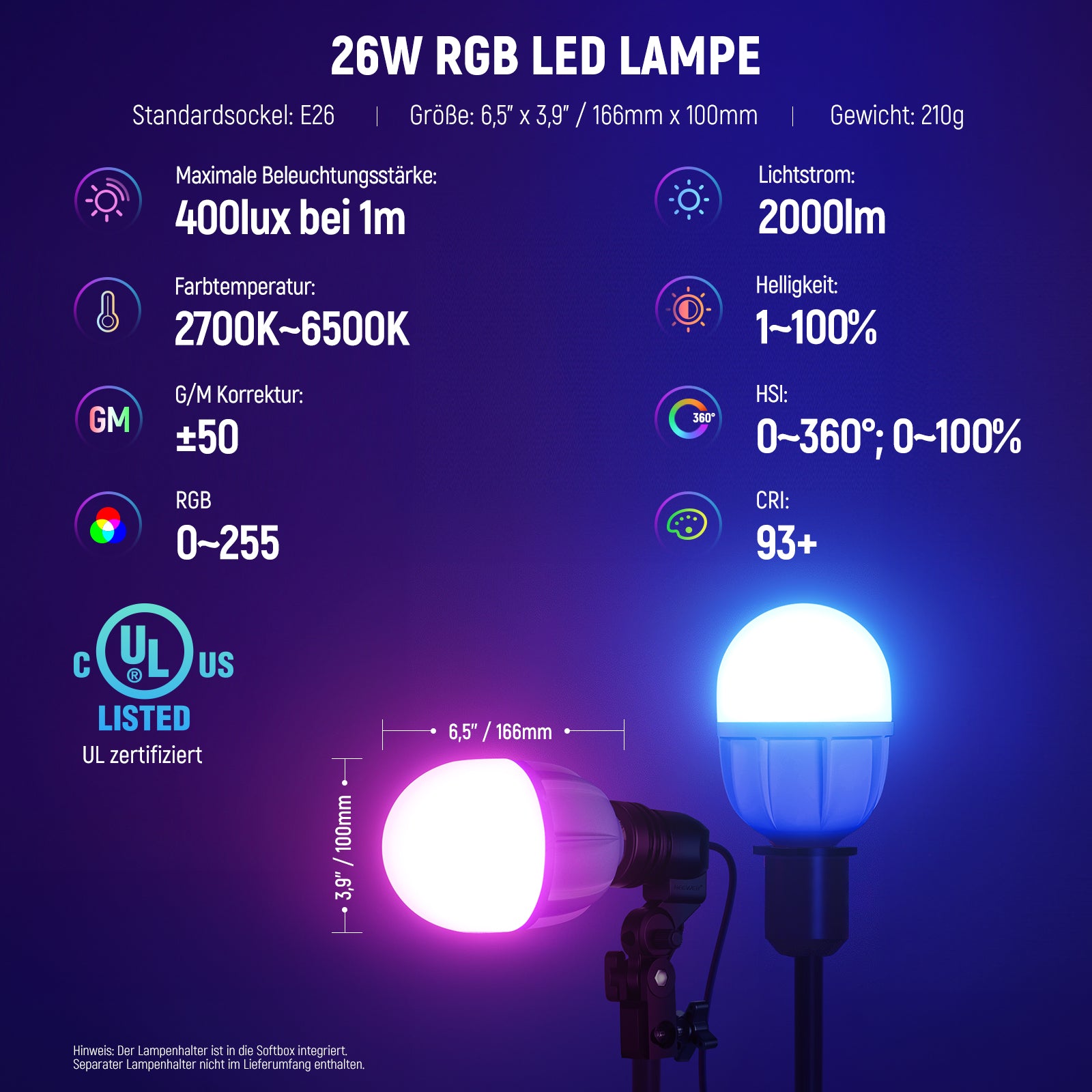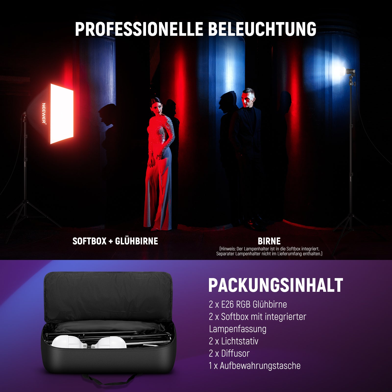 - 【Lieferumfang】 1/2 x 24W RGB LED Glühbirne, 1/2 x Softbox, 1/2 x Lichtstativ, 1 x Tragetasche
