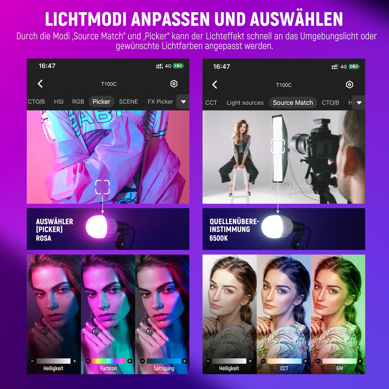 - 【Premium RGB LED Glühbirnen】 CE/UKCA zertifizierte Glühbirnen mit integrierten RGB LEDs bieten 24W Leistung, 400 Lux/m maximale Beleuchtungsstärke, 0–100% Dimmung, 36,000 Farben für kreative Fotografie und Videos, 2700K–6.500K Farbtemperatur für Live Streaming und Studiofotografiebeleuchtung sowie CRI93+/TLCI98+ für präzise Farbwiedergabe