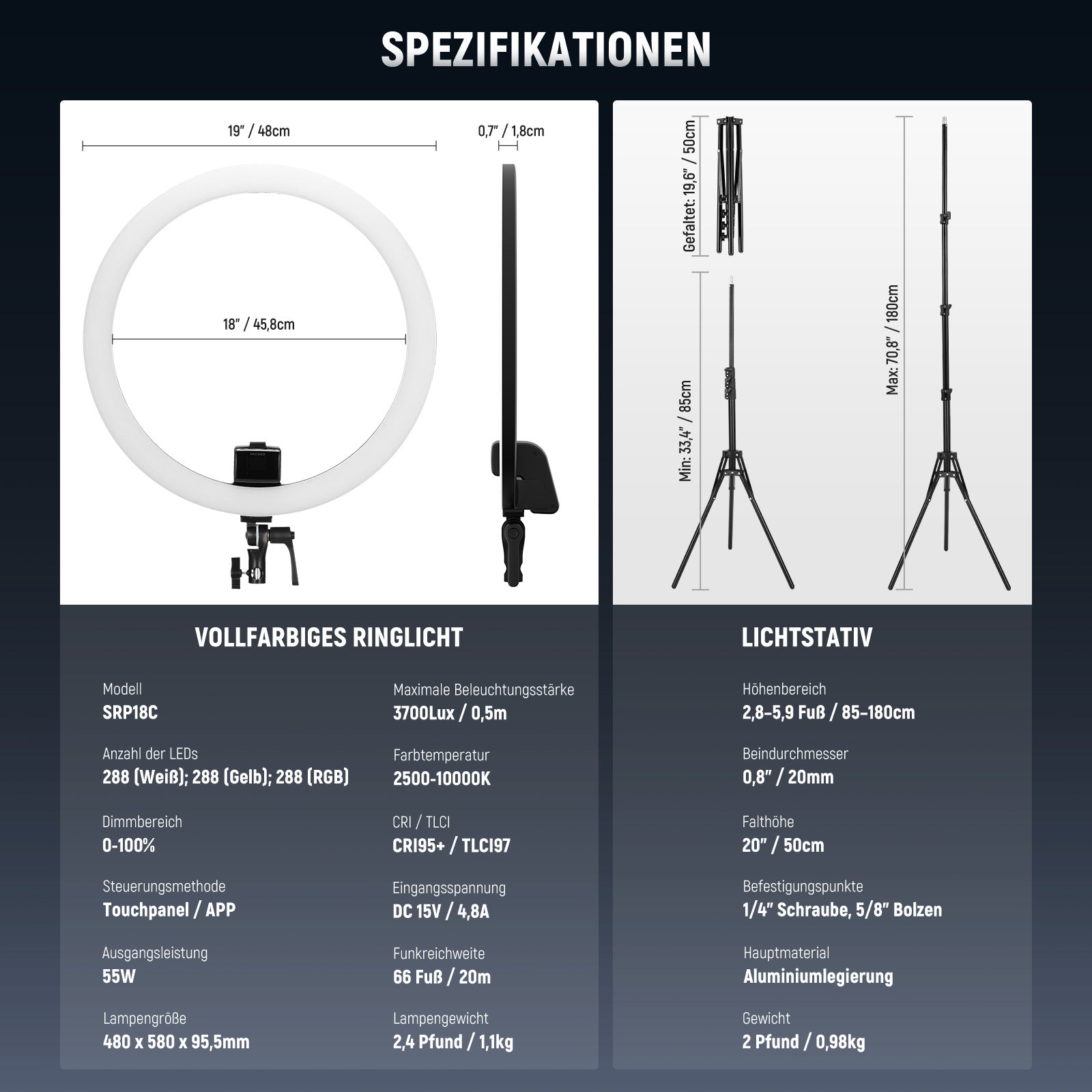- 【18" intelligentes RGB Ringleuchte】 SRP18C Ring Licht ist ein schlankes Ringlicht mit 864 hochwertigen LEDs (288 davon sind RGB), 55W Ausgangsleistung, 3700Lux/0,5m Beleuchtungsstärke und CRI 95+/TLCI 97 für eine originalgetreue Farbwiedergabe. Die flimmerfreie Beleuchtung ist ideal für Aufnahmen mit hoher Verschlusszeit und seine vielfältigen Funktionen können Live Streaming, Spiele, Make up, TikTok/YouTube Videos, Porträtfotografie und andere Kreationen erleichtern