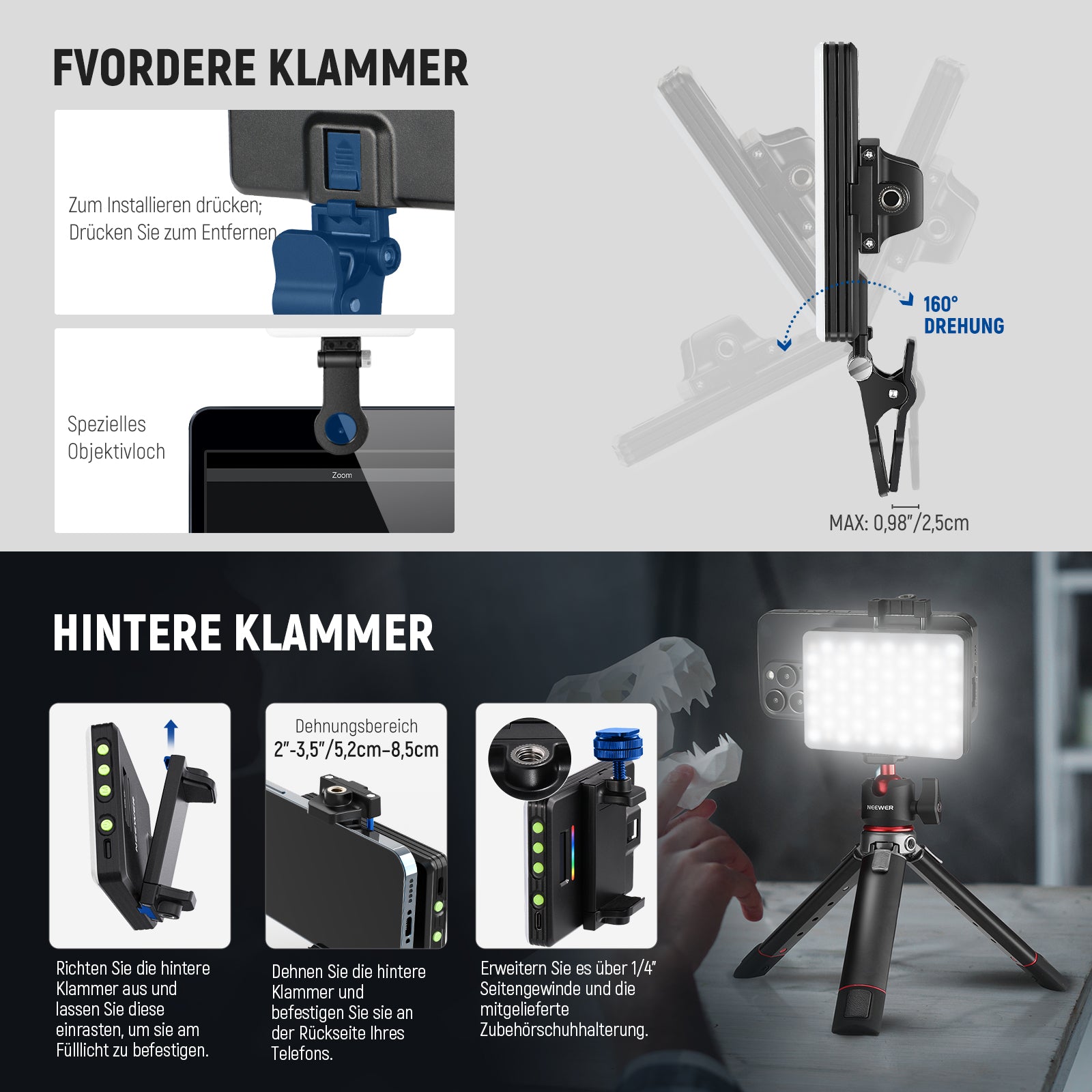 - 【Kameralicht mit Zubehörschuhhalterung】Die Zubehörschuhhalterung funktioniert mit den 1/4" Seitengewinden an der hinteren Klammer, um das Selfie Licht auf Kameras, Stativen usw. mit 5,2-8,5cm zu installieren, kompatibel mit iPhone 15 Pro Max 15 Plus 14 13 12 Pro Max Mini Samsung Galaxy Note Google Pixel Huawei usw. Die vordere Klammer passt auf Telefone, Tablets oder Laptops mit einer Dicke von weniger als 2,5cm und verfügt über ein spezielles Objektivloch zum Filmen