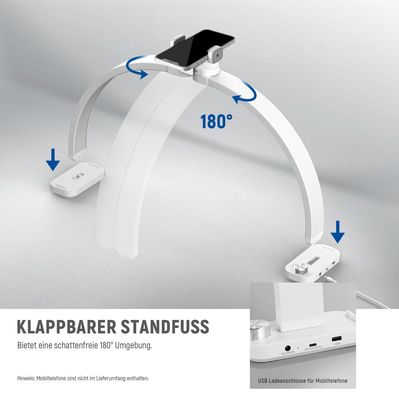 - USB Ladeanschlüsse für Telefone- Einer der Armlampensockel ist mit zwei USB Ausgangsanschlüssen ausgestattet, die Ihr Telefon und Tablet mit 5V 1A aufladen können und sicherstellen, dass Ihren Geräten bei längeren Aufnahmesitzungen nie der Akku ausgeht