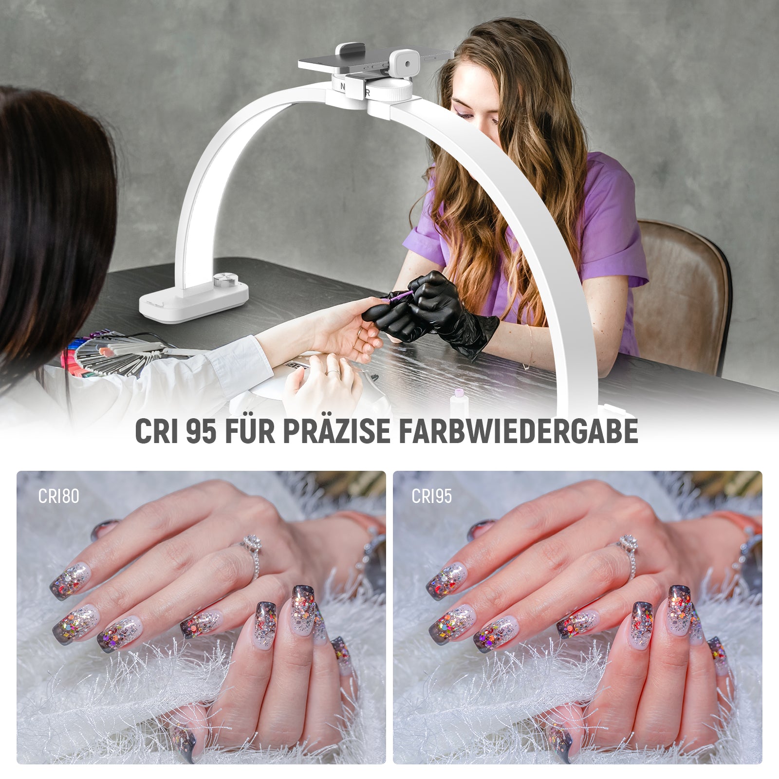 Vielseitiges und multifunktionales Licht- Diese vielseitige und multifunktionale LED Halbring Halo Lampe ist unverzichtbar für Schönheitssalons, Nagelstudios, Make up Artist Studios und Inhaltersteller. Sie ist die perfekte zentrale und sanfte Beleuchtung für Maniküre, Schminken, Wimpernverlängerung, Tätowierkunst, Tutorial Fotos und Aufnahmen. Ein absolutes Muss für Influenzer und Streamer, um Nagelpflege Videos zu filmen oder Live zu Streamen und Luftaufnahmen zu machen