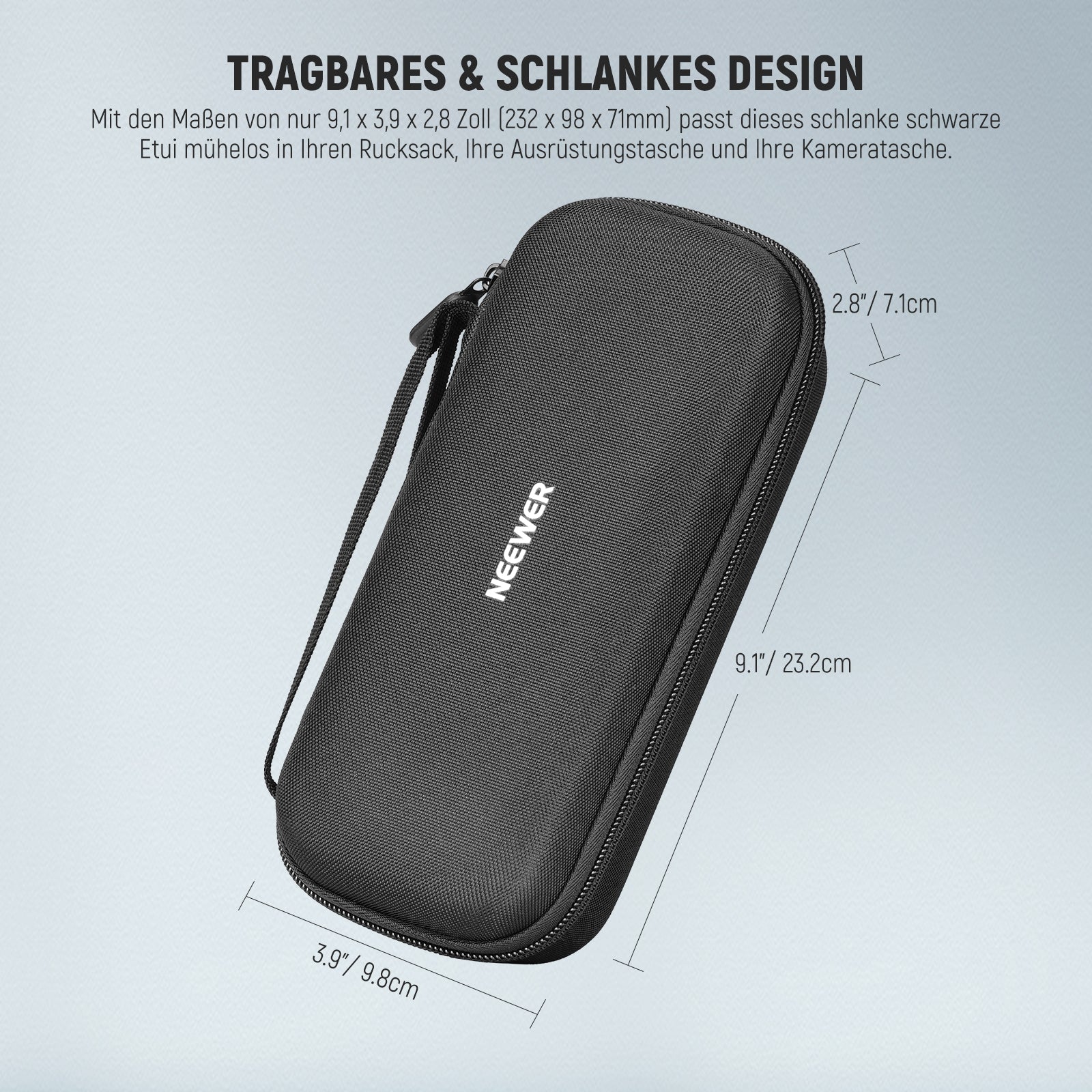 Tragbares und elegantes Design- Mit nur 9,1 x 3,9 x 2,8 Zoll (232 x 98 x 71 mm) passt diese elegante schwarze Tasche mühelos in Ihren Rucksack, Ihre Ausrüstungstasche und Ihre Kameratasche. Eine integrierte Handschlaufe ermöglicht ein bequemes Tragen