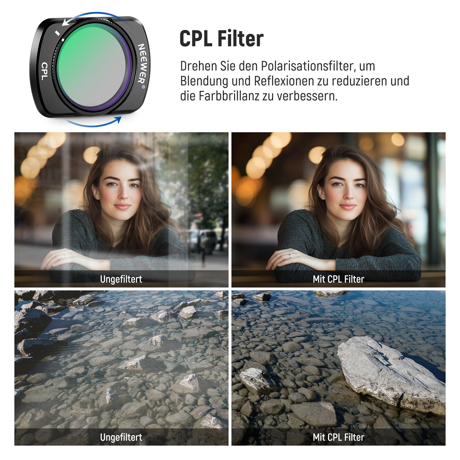 - Kompatibel mit DJI Osmo Pocket 3- NEEWER Filterset sind unverzichtbare Fotografie Ausrüstung und ein Muss für Ersteller von Inhalten und Influencer. Kompatibel mit DJI OSMO Pocket 3 Gimbal Kamera. Der CPL Filter reduziert die Blendeffekte, um die Außenaufnahmen zu verbessern, während das Weitwinkelobjektiv Ihren Blickwinkel auf 108 ° für Reiseberichte, Action Momente und dynamische Inhalte in sozialen Medien erweitert. Enthält zwei Displayschutzfolien aus gehärtetem Glas zum Schutz vor Kratzern