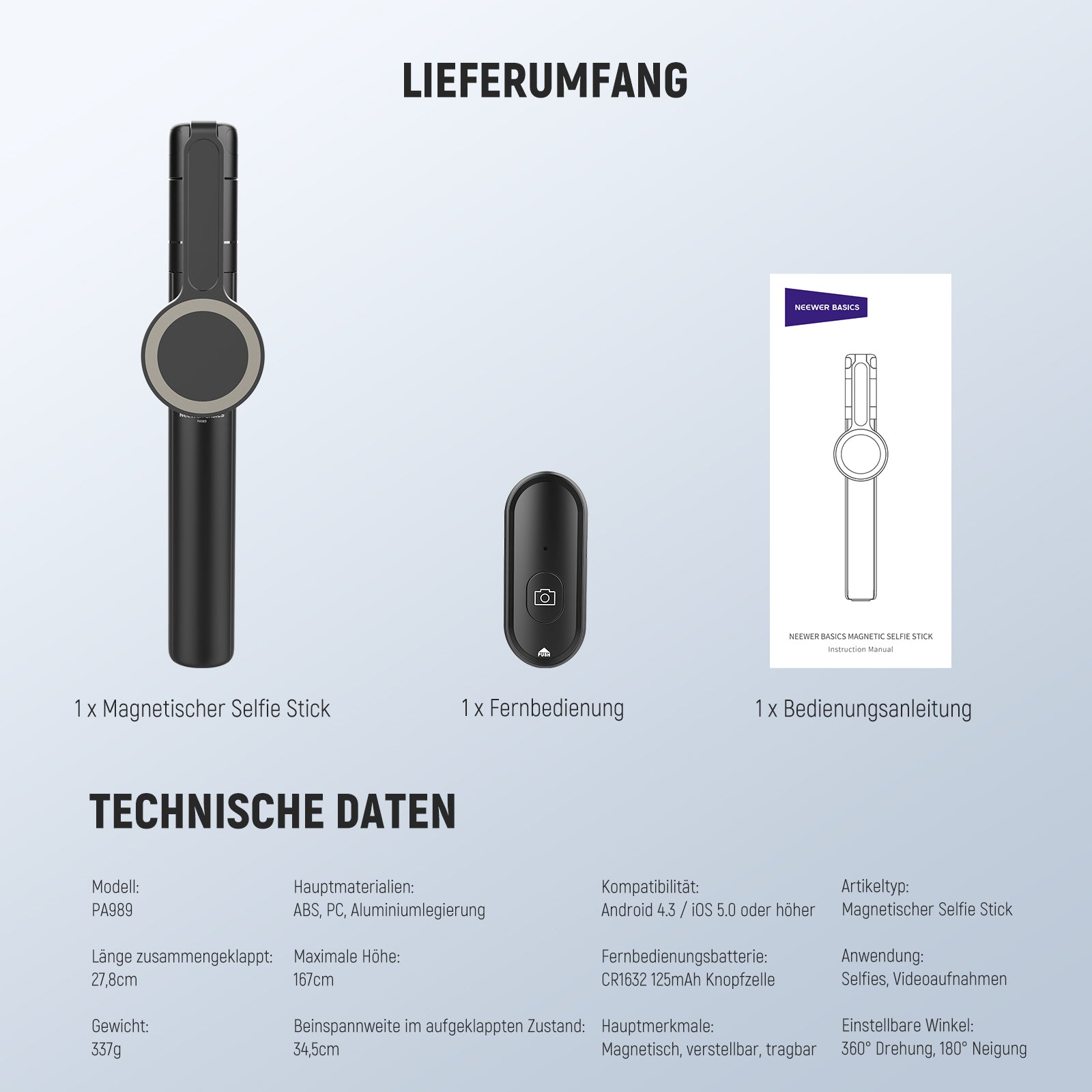 - Vorstellung von NEEWER BASICS- NEEWER BASICS ist eine einfache und praktische Produktreihe, die sich auf wesentliche Funktionen und Designs konzentriert, ohne unnötige Extras und Materialien. Der PA989 ist ein 3 in 1 ausziehbarer magnetischer Telefonständer mit einstellbarer Höhe und Neigung, der als Selfie Stick, Bodenständer für Telefone und Mini Tischstativ für verschiedene Aufnahmesituationen verwendet werden kann