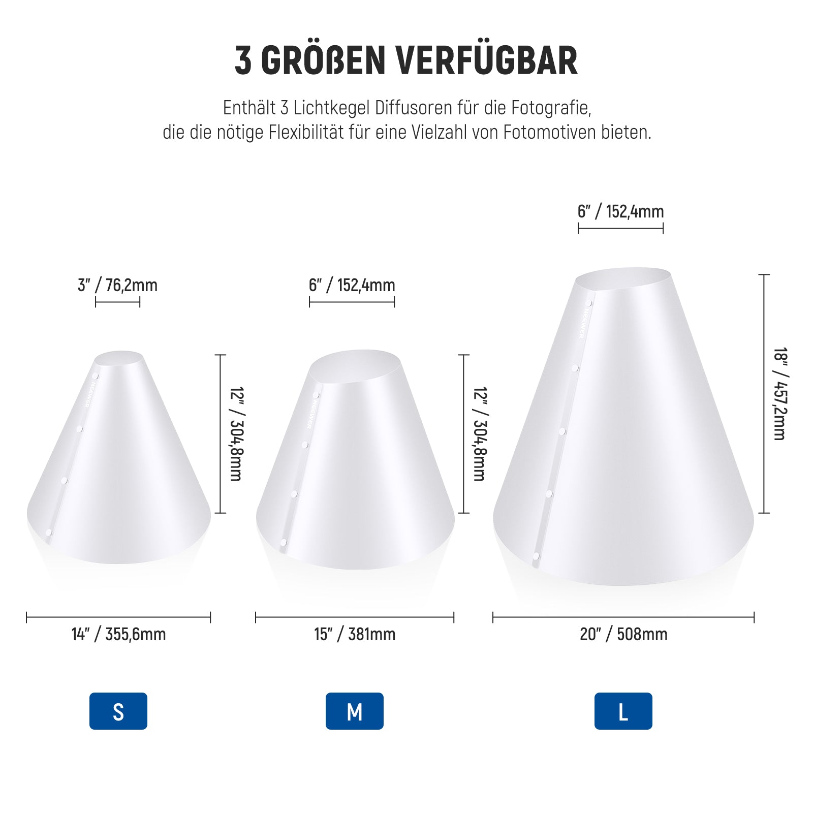 - 3 Größen verfügbar- 3PCS Lichtkegel Fotografie Diffusoren (14"/356mm, 15"/381mm, 20"/508mm) geben die Flexibilität für eine Vielzahl von Fotografie Themen benötigt. Perfekt zum Aufnahme von Ringen, Halsketten, Uhren und anderen kleinen persönlichen reflektierenden Gegenständen, auch für reflektierende Haushaltsprodukte wie Wasserhähne, Duschen, Wasserkocher, Toaster und Haartrockner geeignet. Selbst der kleinste Kegel ist mit iPhone 15 kompatibel, um Ihre Produkte perfekt zu präsentieren