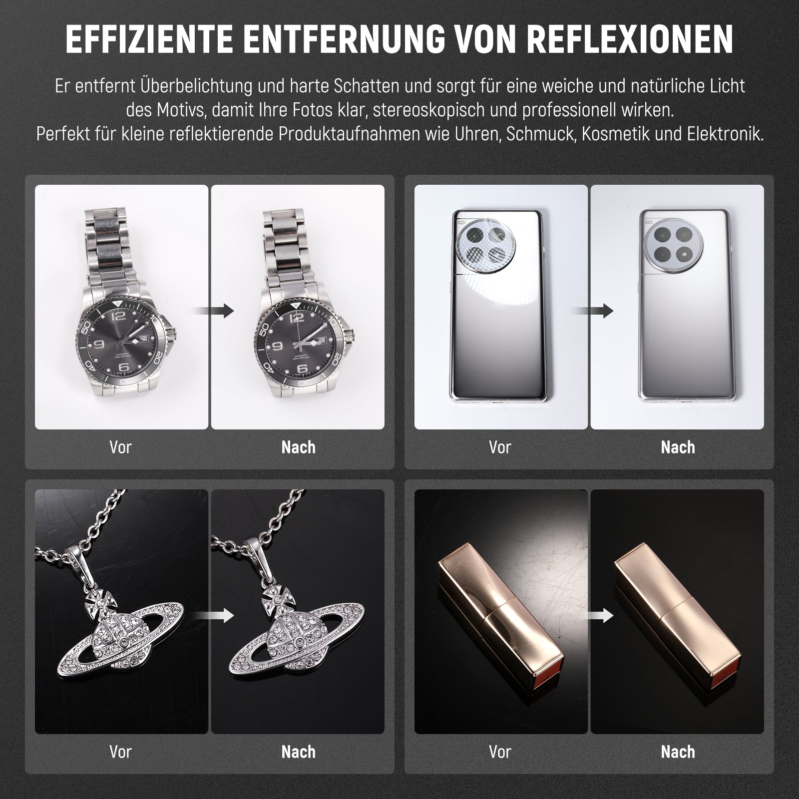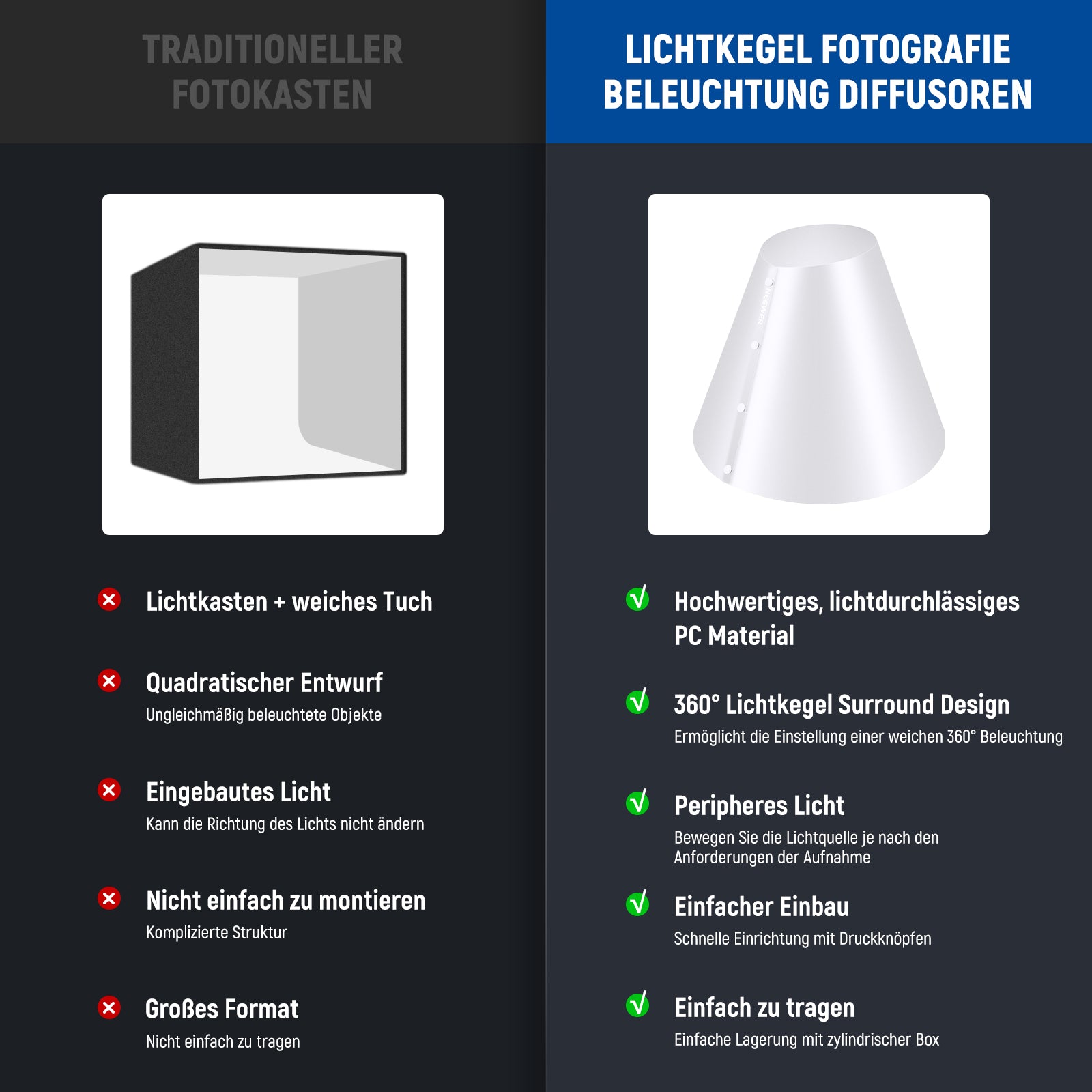 - 360° Lichtkegel Umgebungs Design- Der Lichtkegel für 360 Grad umgibt das Motiv und bietet eine 360°Einstellung der weichen Beleuchtung, um grelle Blendung durch glänzende Produkte effizient zu eliminieren. Die schräge obere Öffnung ermöglicht einfaches Fotografieren und bietet verschiedene Winkel, um die besten Aufnahmen Ihrer Motive zu machen