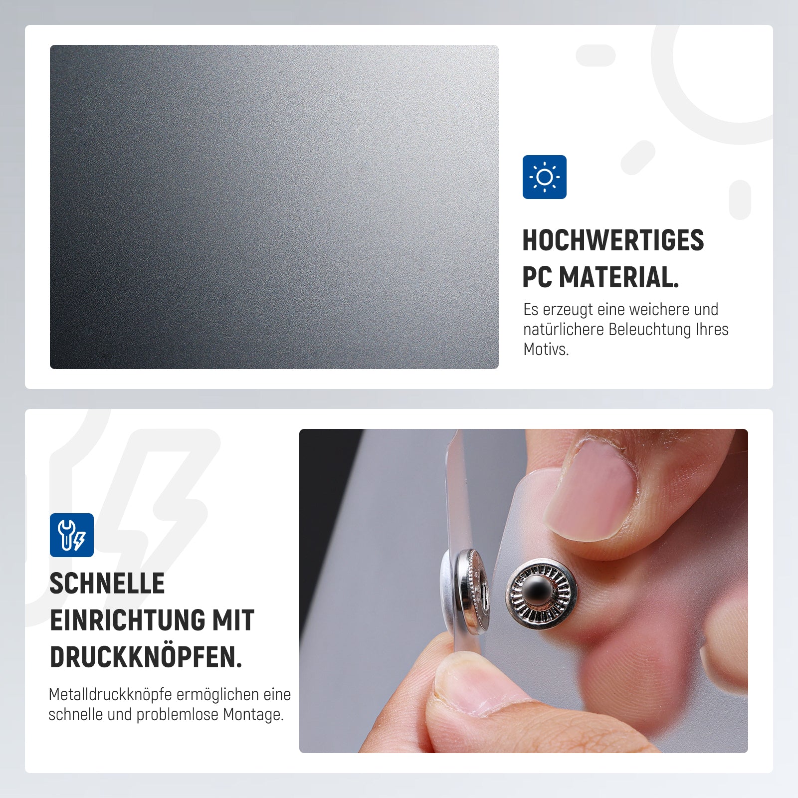 - Schnelle Einrichtung mit Druckknöpfen- Druckknöpfe aus Metall ermöglichen eine schnelle und problemlose Montage, sodass Sie schnell und ohne Verzögerung mit den Aufnahmen beginnen können