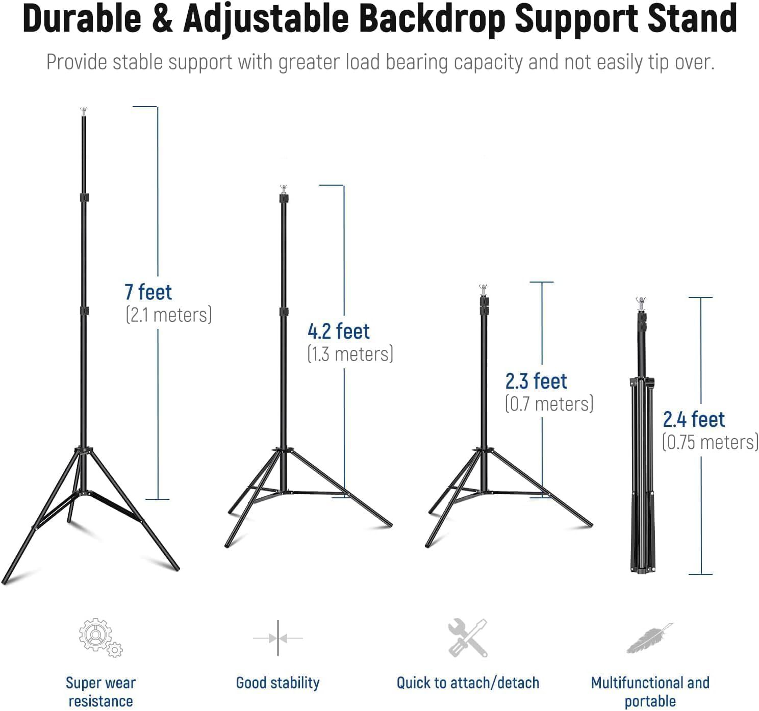 - Einstellbare Höhe und Breite: Mit der einstellbaren Höhe (27,56"-7‘ / 70cm-2,1m) und Breite (5‘-10' / 1,5-3m) hält das Kulissenständersystem Ihre Kulisse an Ort und Stelle und hilft Ihnen, verschiedene Hintergründe für die Fotografie zu schaffen