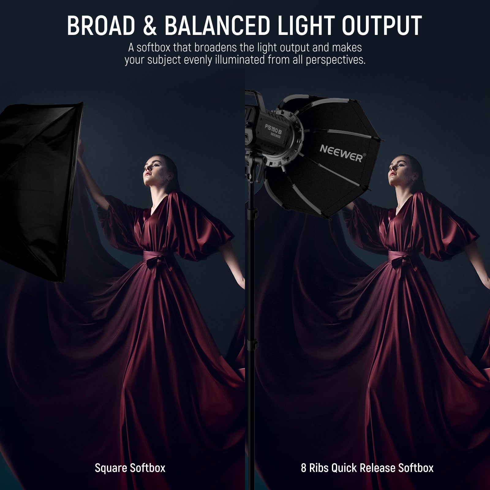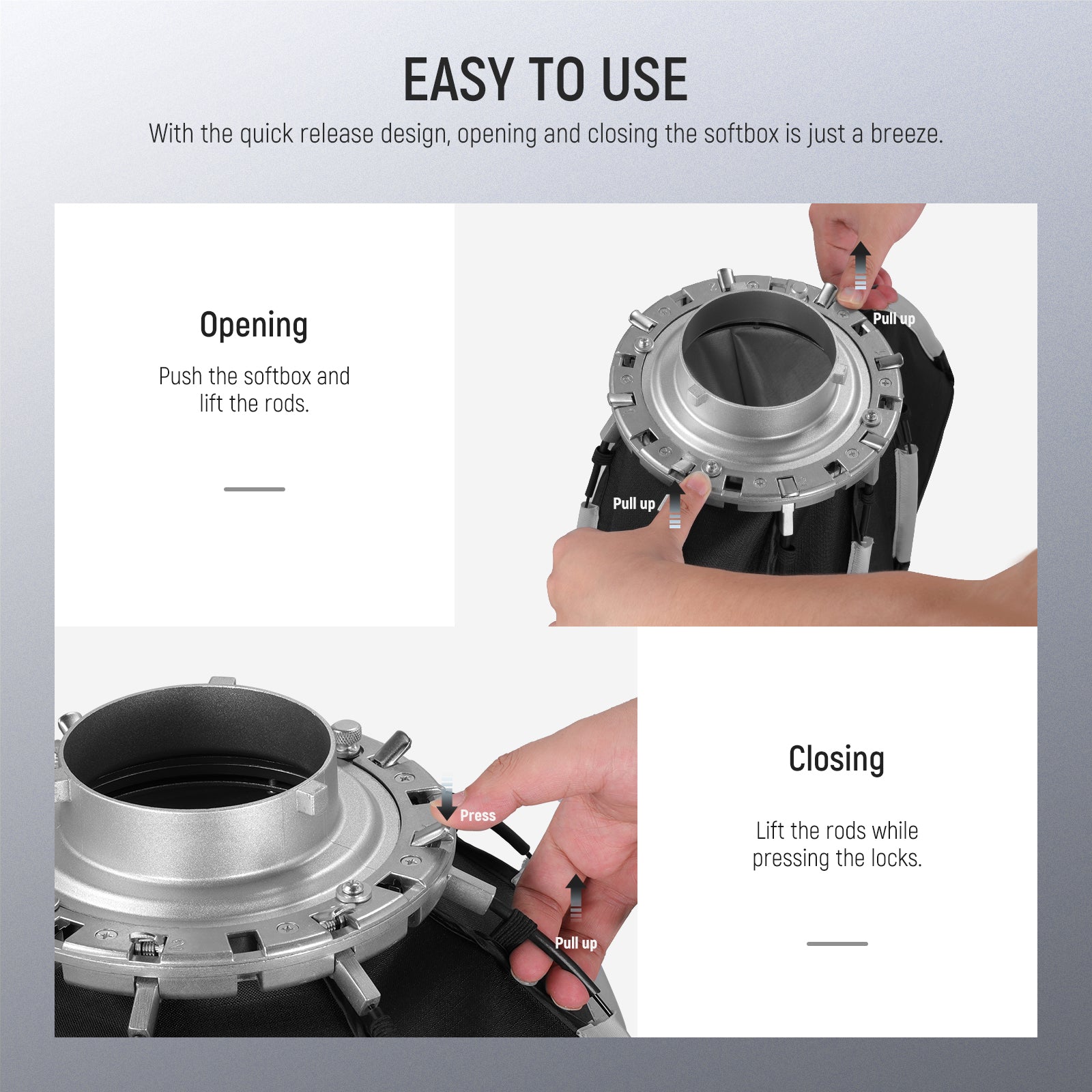 - 【Schnelles Zusammenklappen und externe Rippen】Ziehen Sie die Rippen nach oben, um diese Softbox in Sekundenschnelle zu entfalten und zu verriegeln, und halten Sie dann einfach die Schnellentriegelungsknöpfe gedrückt, um sie zusammenzuklappen. 8 hochbelastbare Rippen sorgen für unvergleichliche Haltbarkeit und eine makellose Form. Sie sind außerhalb der Softbox angebracht und sorgen für eine glattere Innenbeschichtung und eine gleichmäßigere Lichtreflexion, um unerwünschte Schatten zu eliminieren